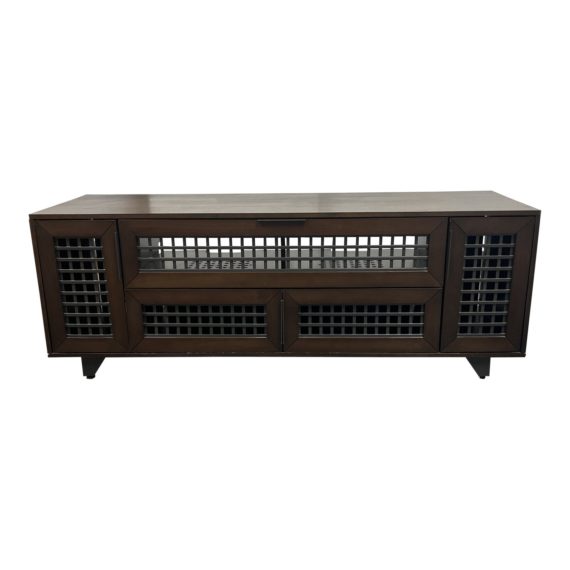 Design Plus Gallery presents a Trillium Series Trillium63 TV Cabinet by Sanus. This TV cabinet was constructed with wood and veneer given a dark walnut finish. The doors feature steel panels that allow airflow to prevent overheating devices. The panels also do not disrupt IR signals. Includes a hidden storage area for smaller equipment. Minor wear from use; missing part of back panel; cabinet is in good condition.