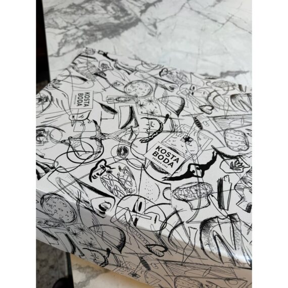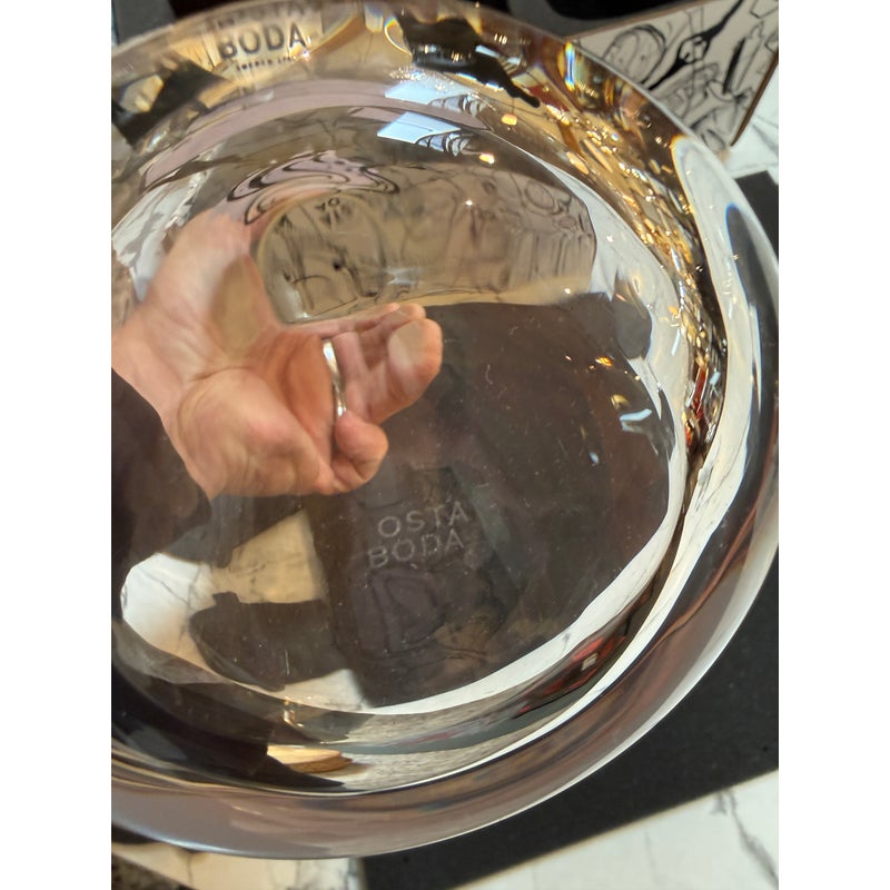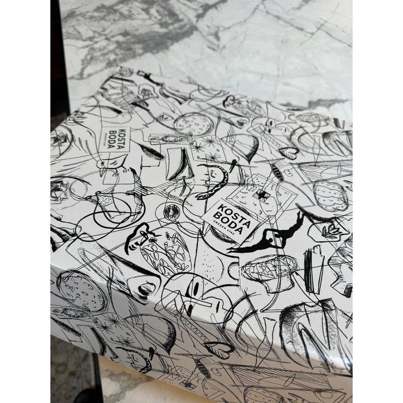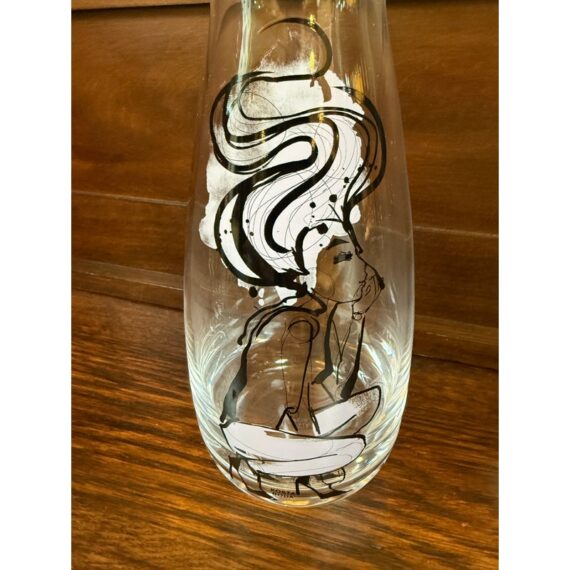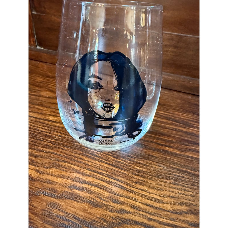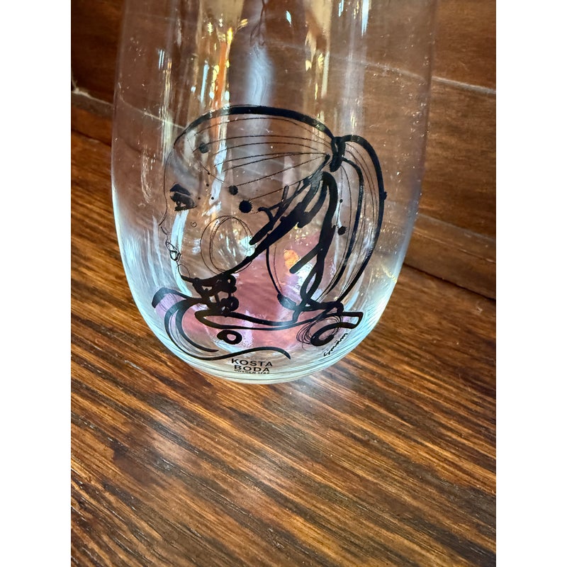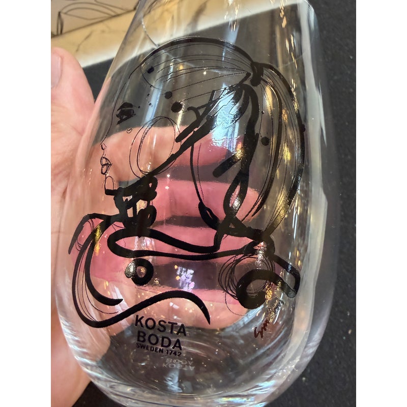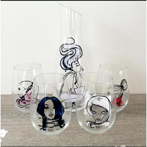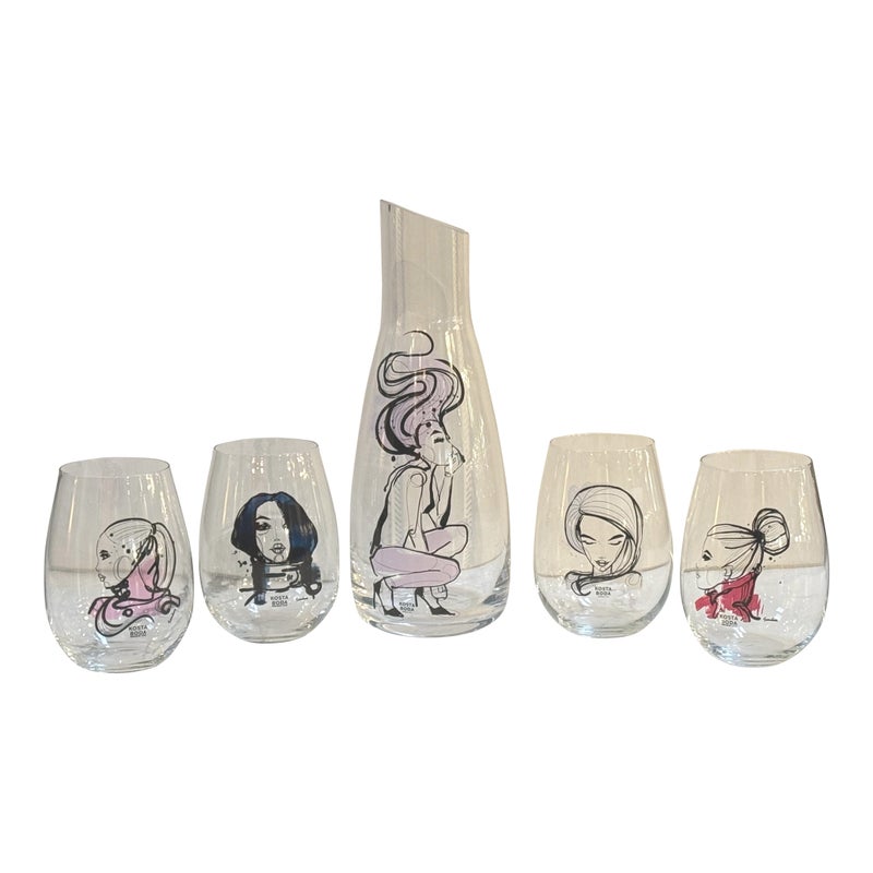 Design Plus Gallery presents an “All About You” Glassware Setby Sara Woodrow for Kosta Boda. This 5-piece set includes a tall decanter and four stemless glasses, each decorated with a different stylized portrait in expressive black linework with accents of color. The collection pairs contemporary glass silhouettes with fashion-inspired illustration for a distinctive visual identity. Kosta Boda markings are visible, and the original box is included. They are in good condition with visible and minimal wear from usage. Made in Sweden.