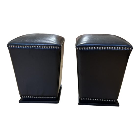 Design Plus Gallery presents a Pair of Mason Ottomans, from Savafieh. The stools are combined form and function by sturdy construction, classic tapered silhouette, and nail head trim. A practical pair, they are crafted with a black wood base, thick cushioning and glossy upholstery. Their dining chair height makes them perfect for extra seating in dining room or additional seating anywhere.