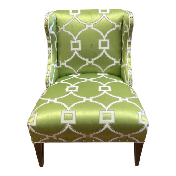 Design Plus Gallery presents a Scalamandre Bel Air Slipper Chair in Circle Fret Absinthe. Custom designed and purchased from the Salamander showroom in LA. Low slipper chair proportions have a tapered winged back and tapered wood legs. A fun polished chrome nail head detail lines the silhouette on the curved sides. Large scale pattern on the fabric emulates the shape of the chair beautifully with the trellis motifs. Visible wear on the fabric, chair is in good condition. Chair adds a vibrant Hollywood Regency pop to any interior.