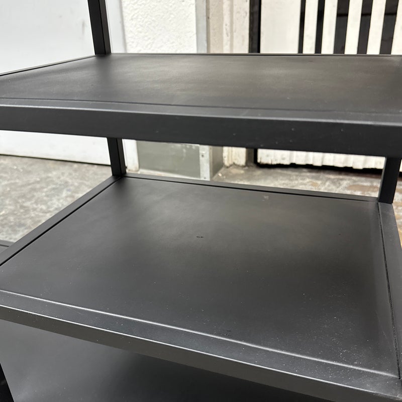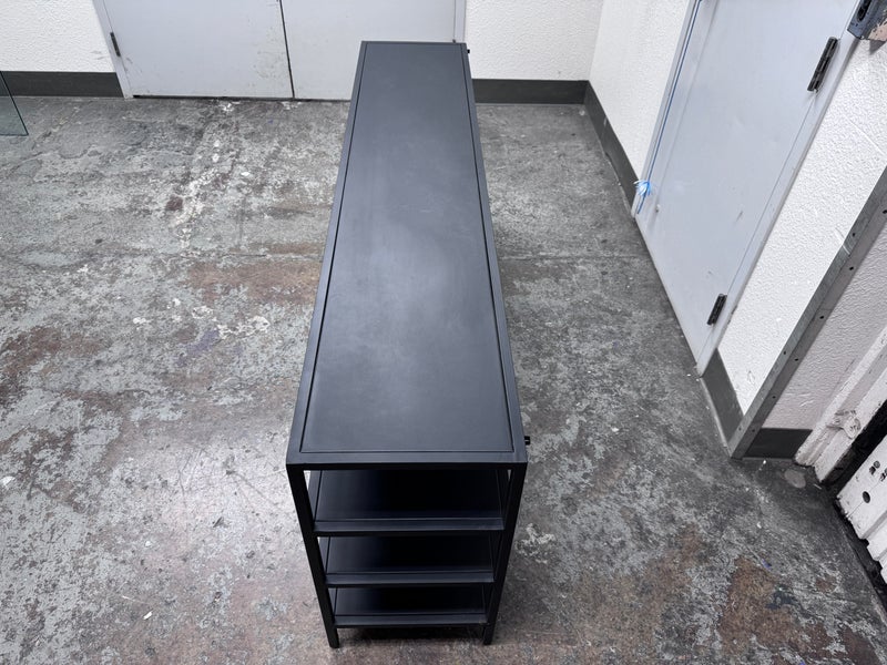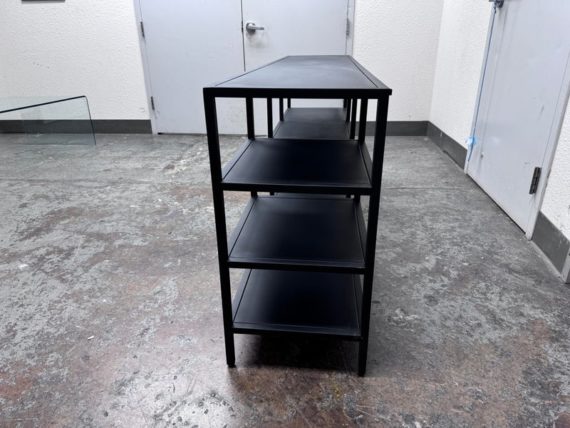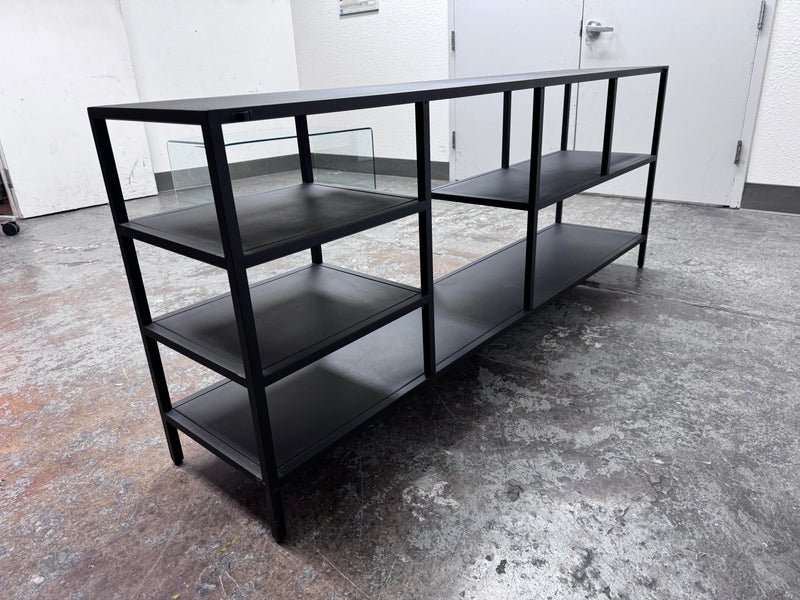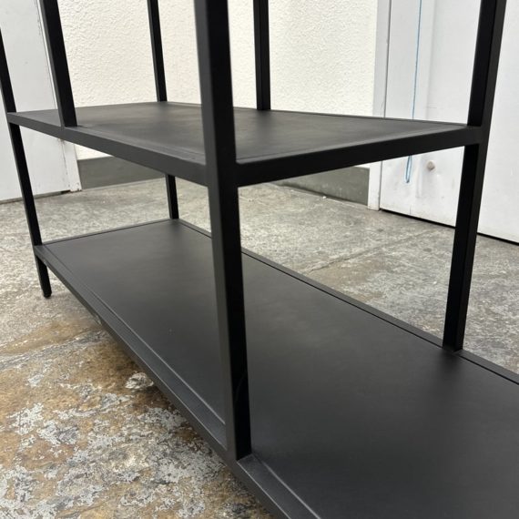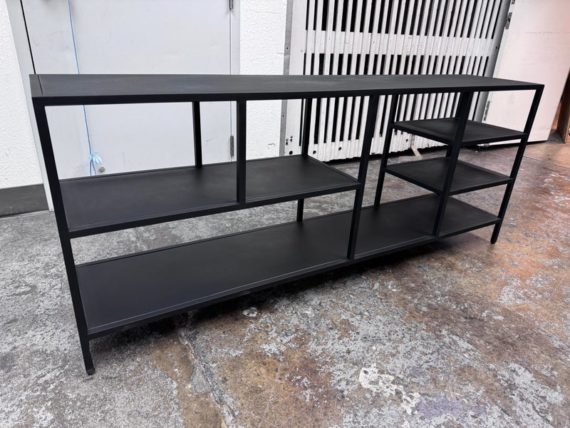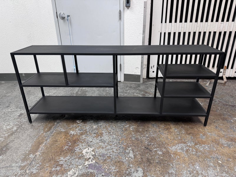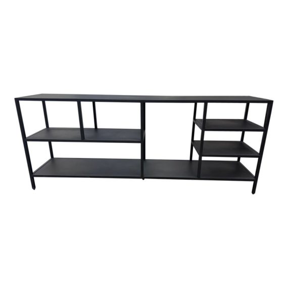 Design Plus Gallery presents the Heroy Bookcase/Console from Scandinavian Designs. Ideal for entryways or media centers, the console is a functional powerhouse. The minimalist industrial design pairs well with most decor schemes. Seven shelves of varying sizes and heights allow for creative freedom when displaying your books, media, plants, photos and more. Made from steel for lasting durability and finished with a matte black powder coat for modern drama. Is in good condition with minimal wear.