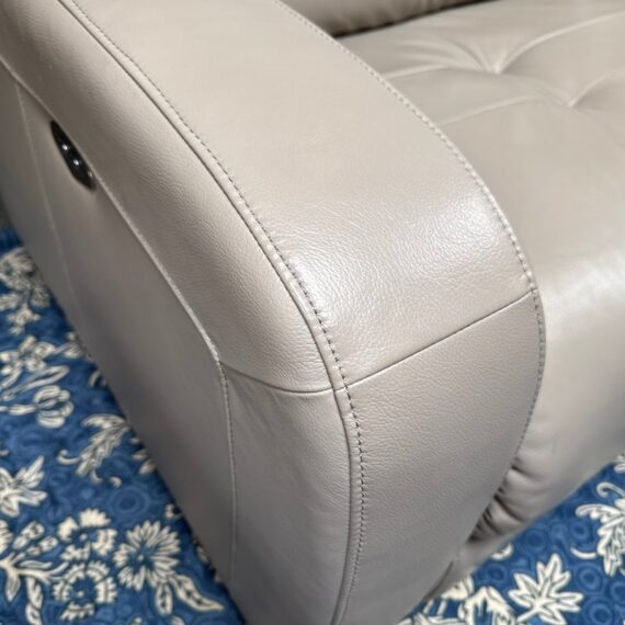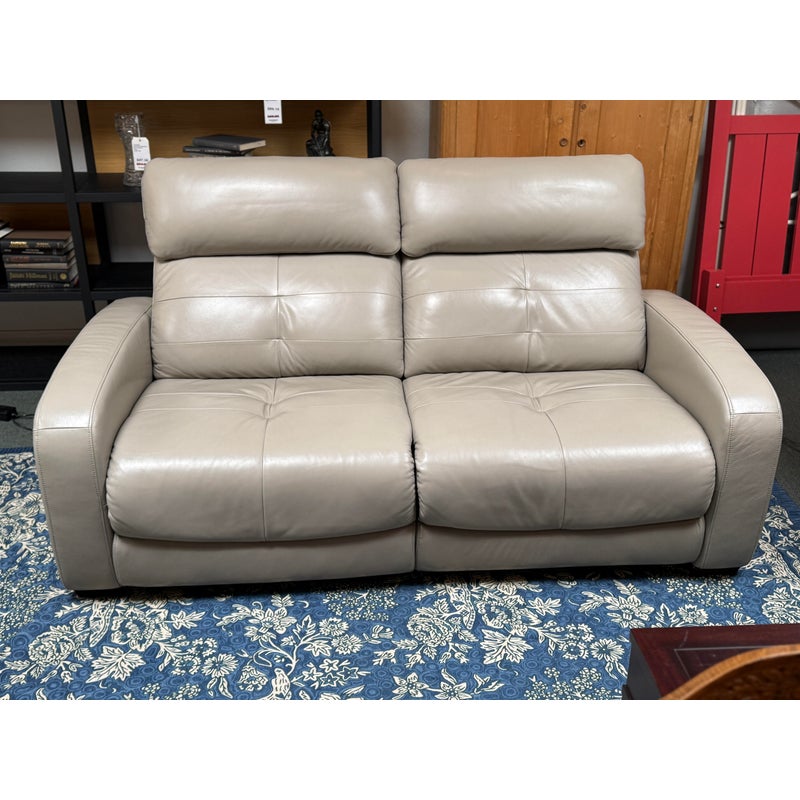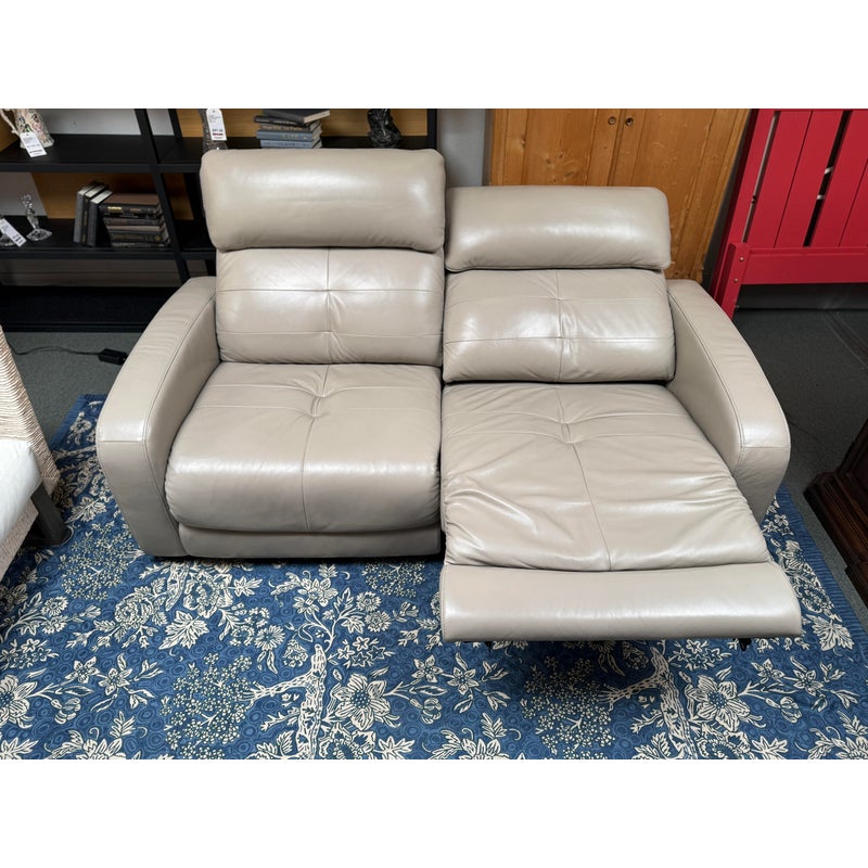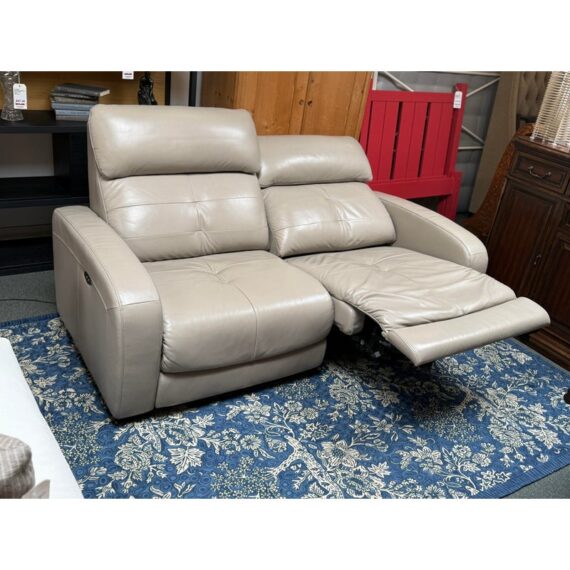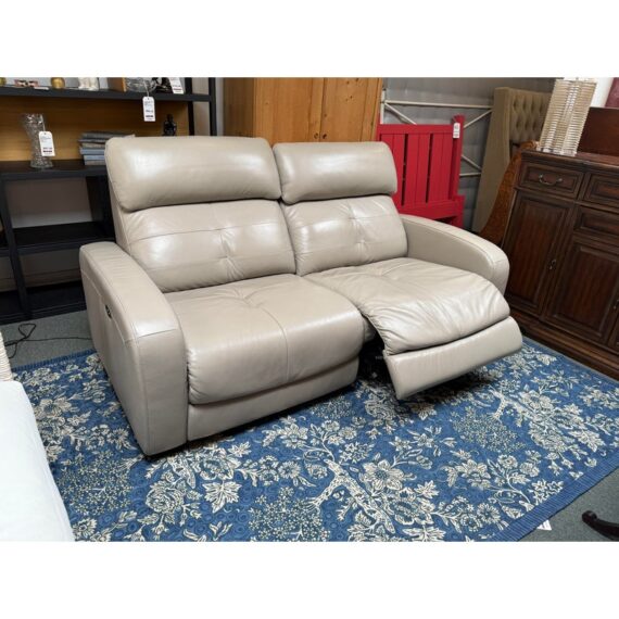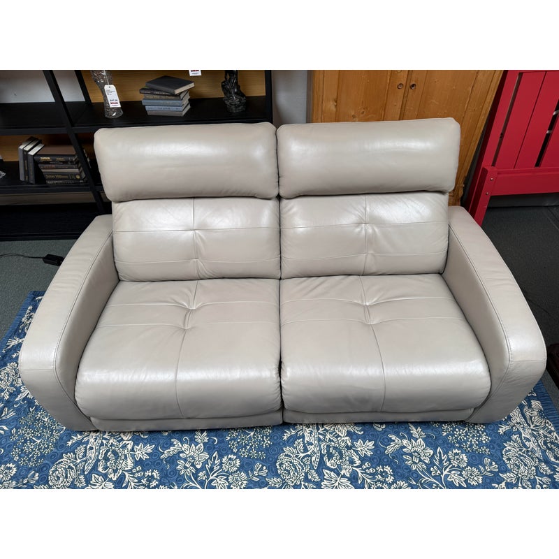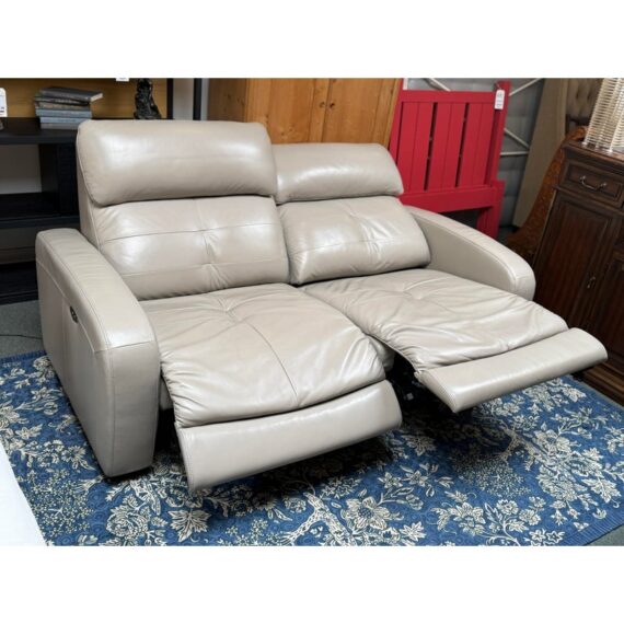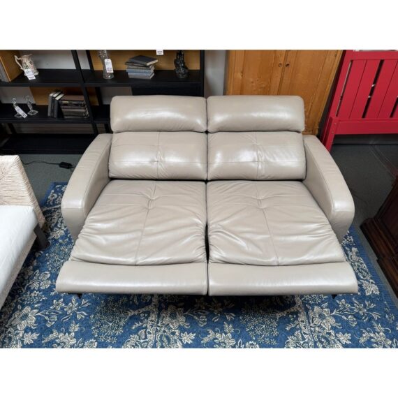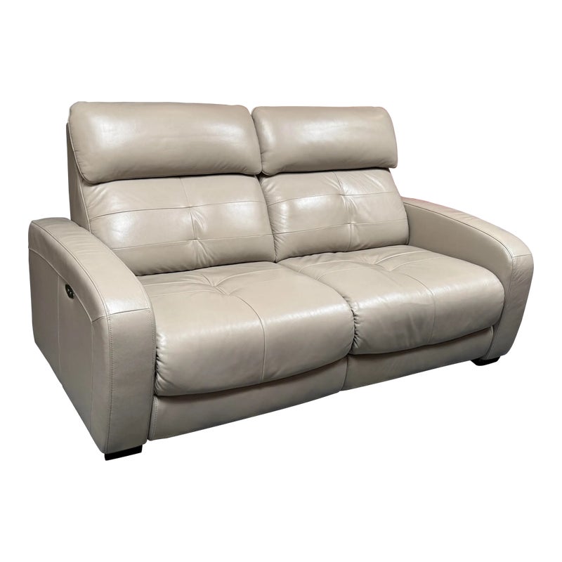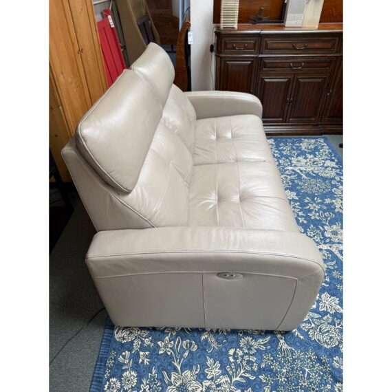Design Plus Gallery presents a Power Recliner Sofa in Silver Gray Leather by Scandinavian Designs. Dual power comfort from the individually adjustable deep plush seats and padded adjustable headrests. Wenge wood feet, sinuous spring suspension. In good condition with some minor and visible imperfections consistent with age and use.