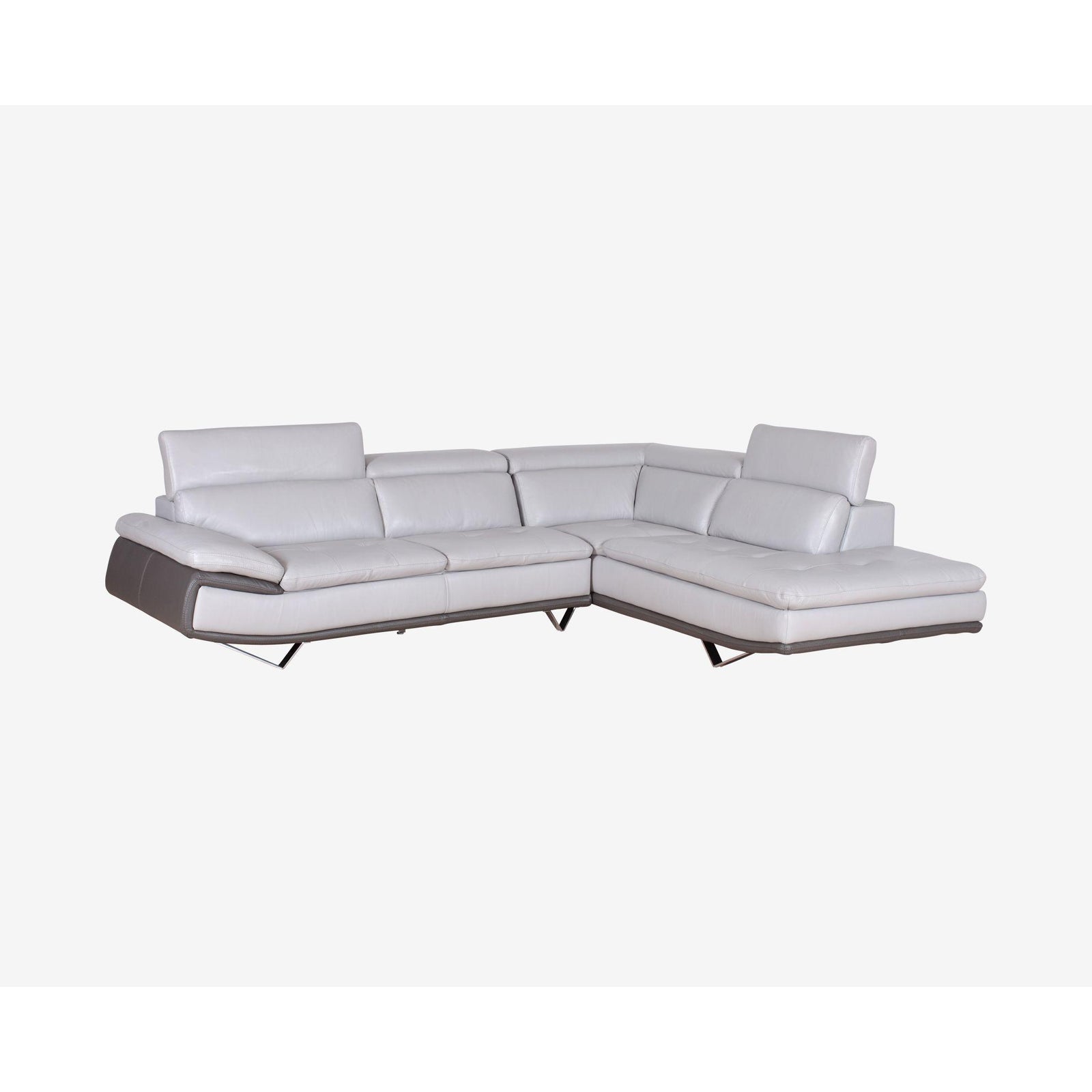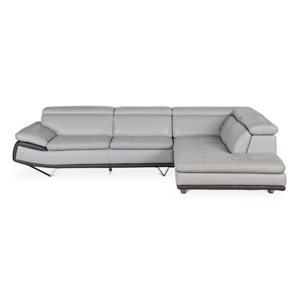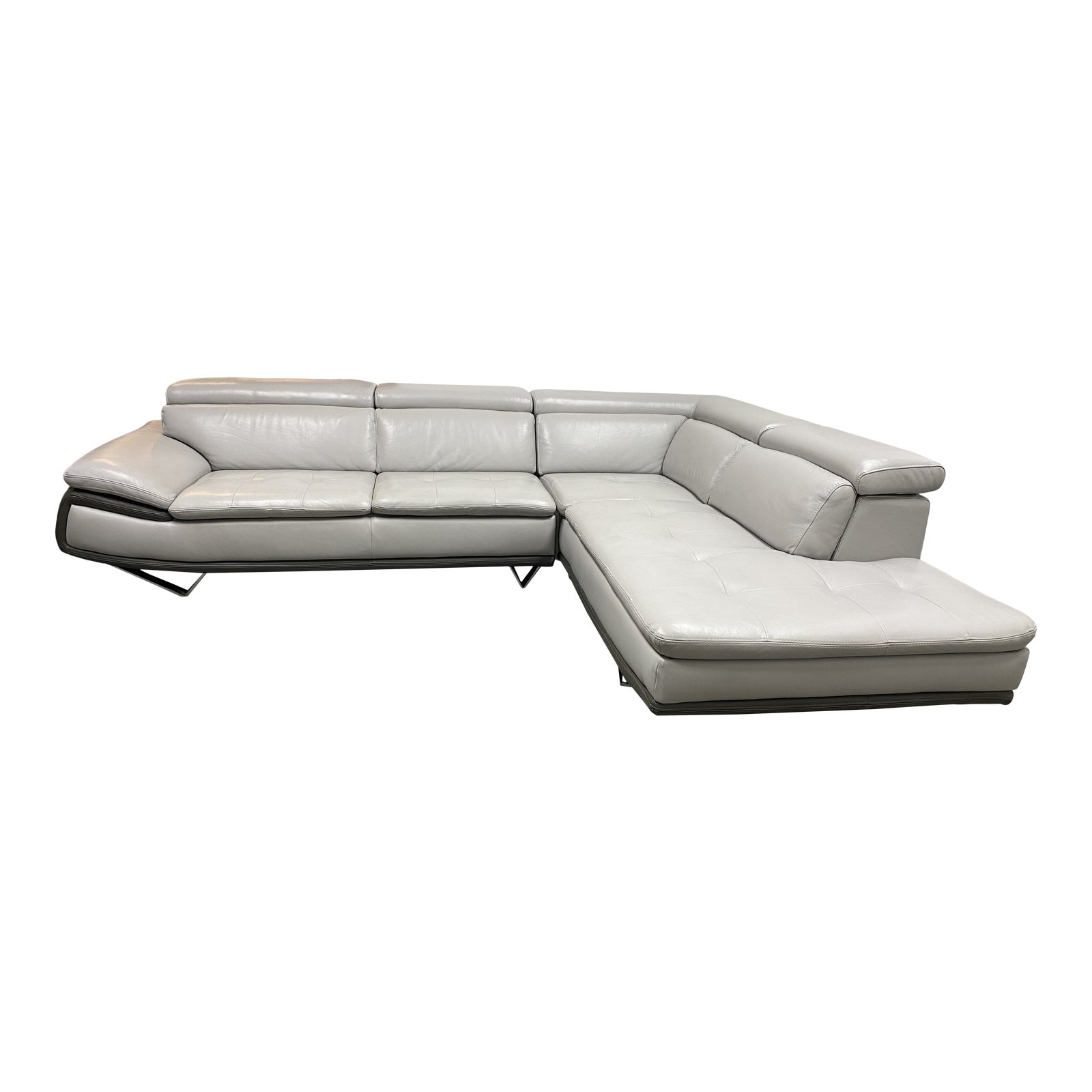 Design Plus Gallery presents a Meringue Leather Sectional by Scandinavian Designs. Ultra contemporary and comfortable, adds style to any setting. Unique to this design are adjustable headrests that both streamline the overall profile and customize your positions. Upholstered in a two tone gray leather.