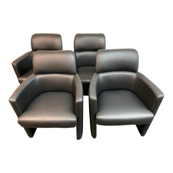 Design Plus Gallery presents a Set of Four Mainio Caster Chairs by Scandinavian Design. Versatile, comfortable and stylish, the fully upholstered leather chairs provide wraparound support with slim arms and slightly canted back. Finished with casters, they move easily where you need them.