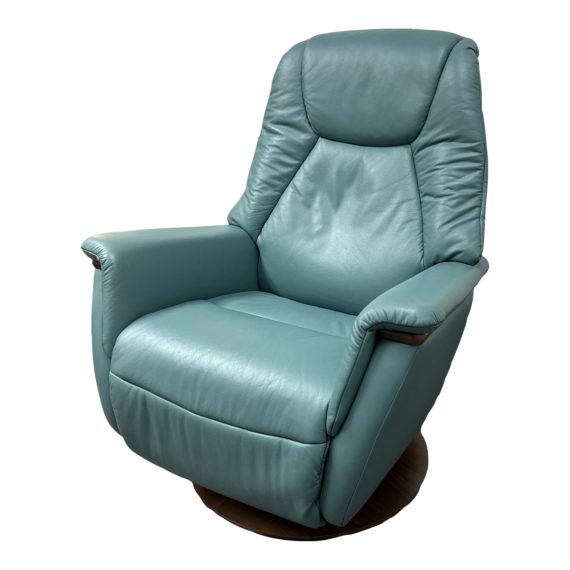 Design Plus Gallery presents a Max Power Recliner by Stressless. Purchased by Scandinavian Designs. Supple, curved padding and luxurious top-grain leather covers state-of-the-art technology designed to meet all your relaxation needs. With the simple touch of a button individually adjust the headrest, backrest and footrest of this chair, or simply enjoy reclining. Lumbar support and a rocking solid walnut base with 360 degree swivel mobility ensure that this chair keeps you seated in style while being able to effortlessly adjust your view as needed. Upholstered in a blue Paloma leather with a Teak moon base. Minor wear from usage.