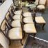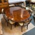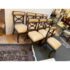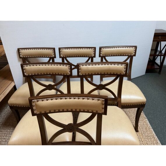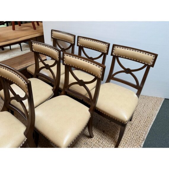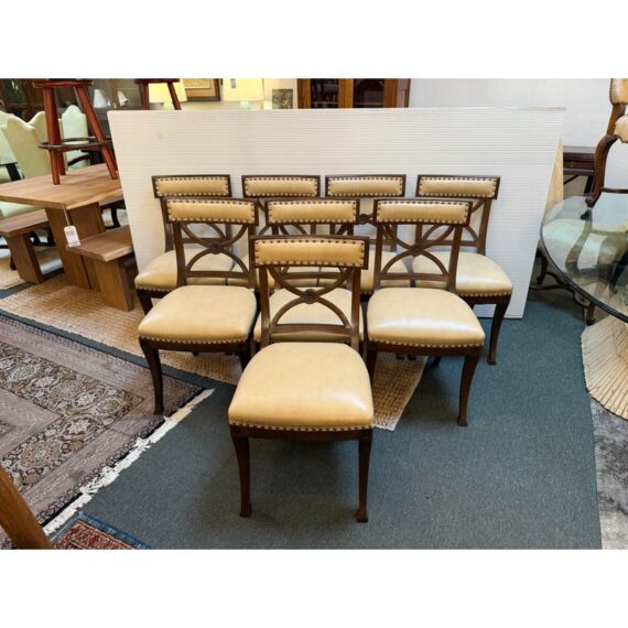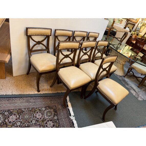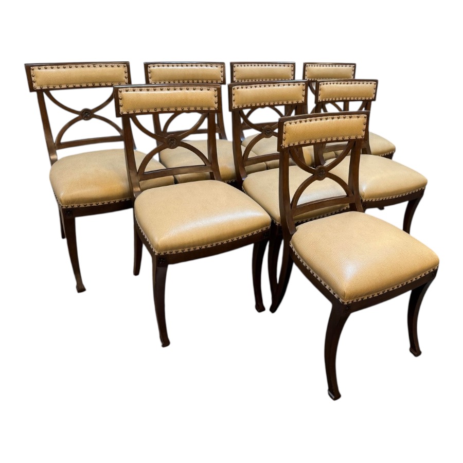 Design Plus Gallery present a Set of Eight Mahogany Dining Chairs by Schumacher. The chairs take on a French Empire Revival style that primarily dated from the late 19th to mid-20th century. The chairs have Neoclassical design elements like their mahogany frames, and architectural silhouettes. The frames have tan leather upholstery with nailhead connecting those two materials. They are in good overall condition for their usage with minimal signs of visible wear.