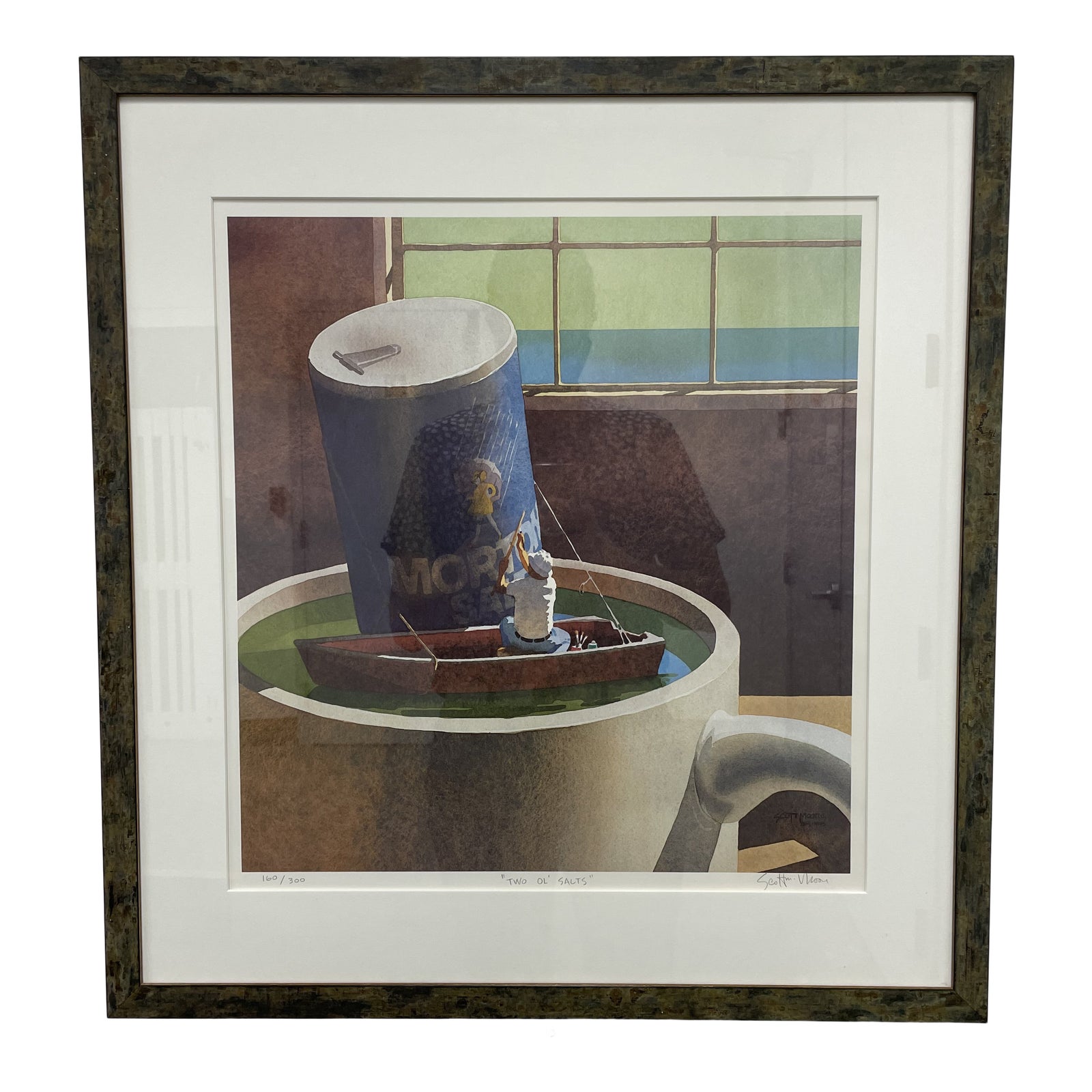Design Plus Gallery presents a Scott Moore “Two Ol Salts” Lithograph. Signed and numbered by the artist in graphite in the lower corners of the print. The frame has a heavy patina of a verdigris finish which complements the depth of the watercolor brilliantly. Fun and playful pop art vibe references culture with a surreal juxtaposition in the content. Minor wear through out, art piece is in good condition.