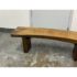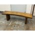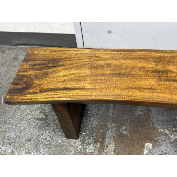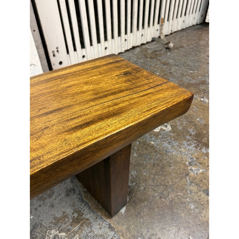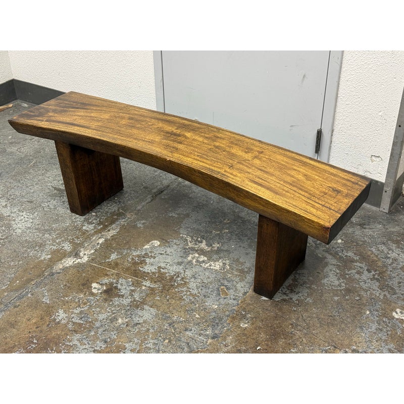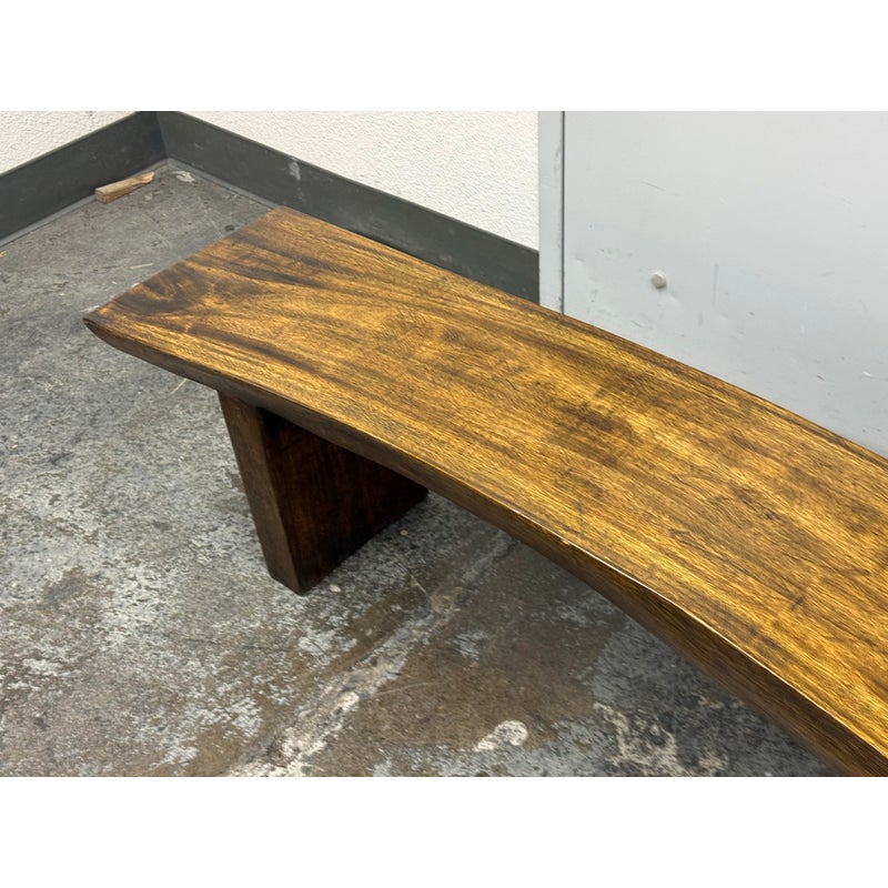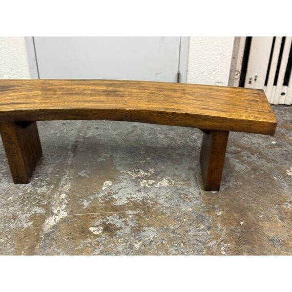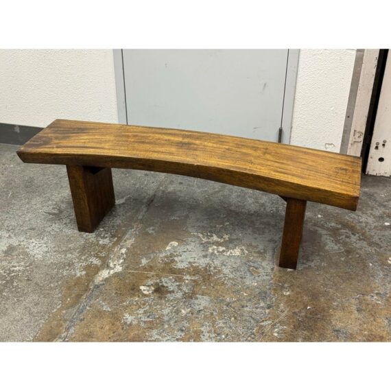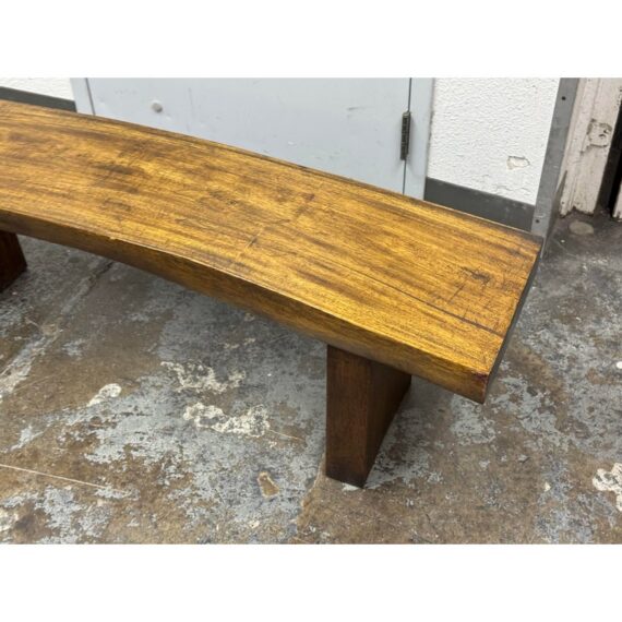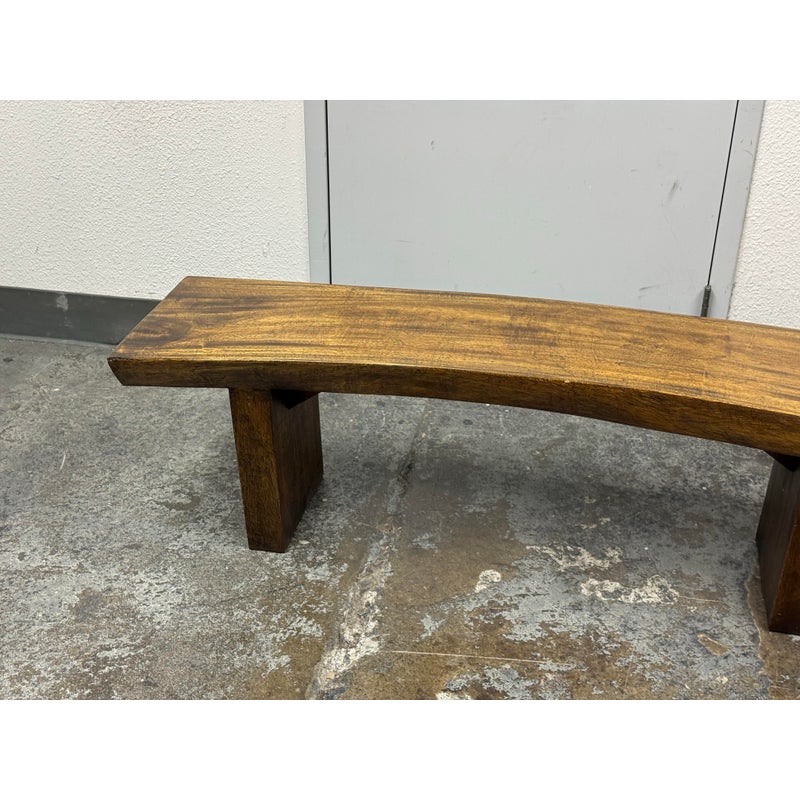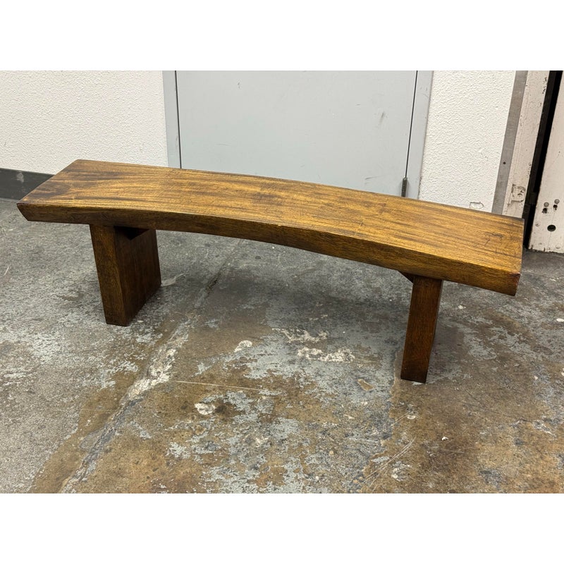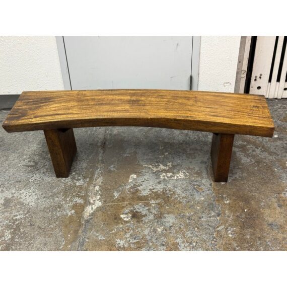Design Plus Gallery presents a Sculptural Solid Wood Bench. It has a gently bowed top and substantial plank legs. The elongated silhouette is defined by organic wood grain, tonal variation, and a hand worked character that gives the piece a distinct presence. The thick seat and angular supports create a bold profile, while the natural markings and visible grain movement add depth and texture throughout. It is in good condition with visible scratches and minimal wear from usage.