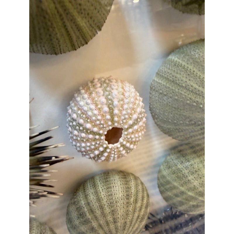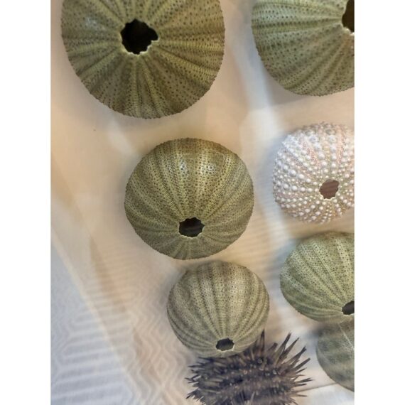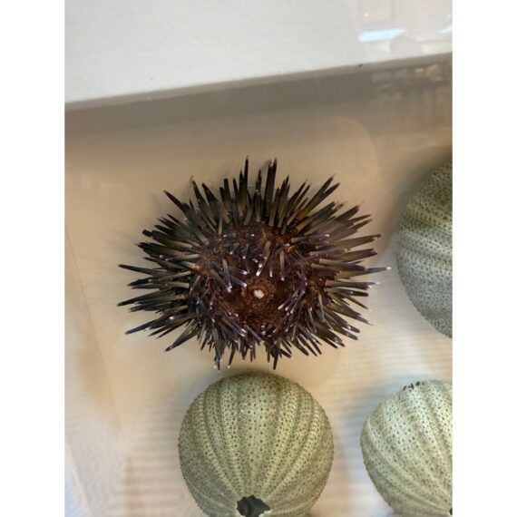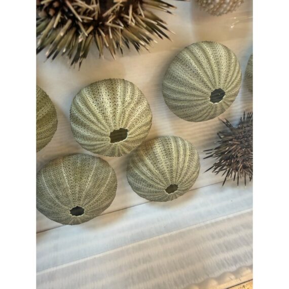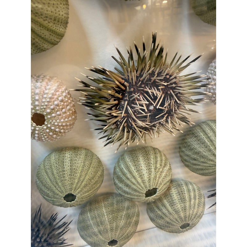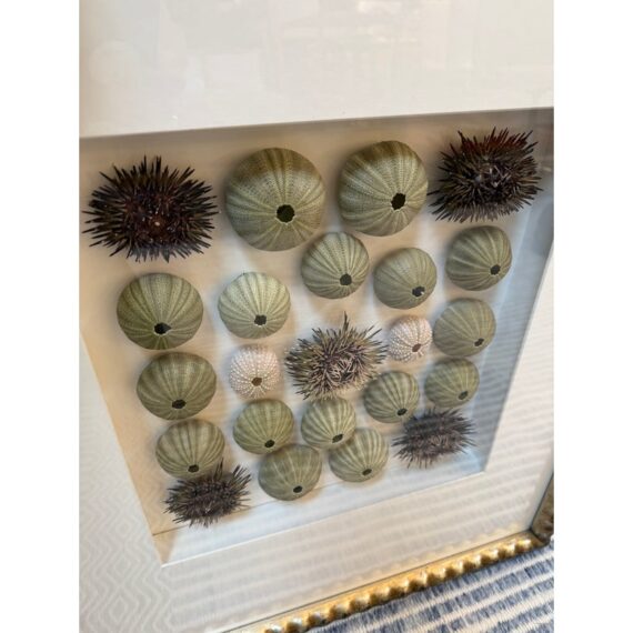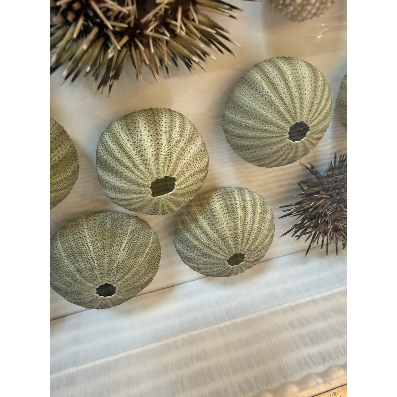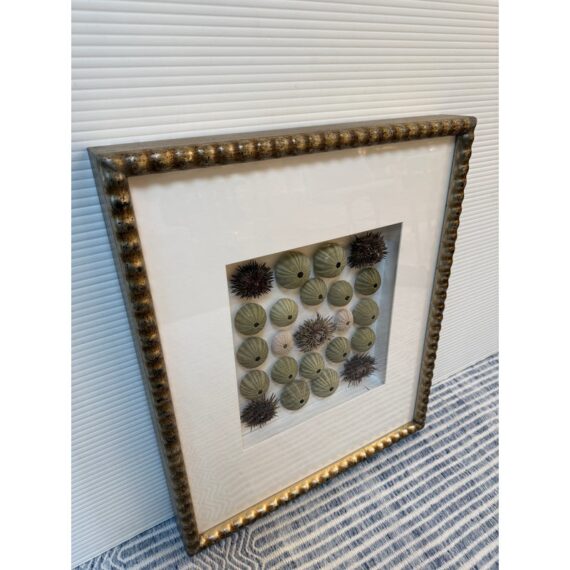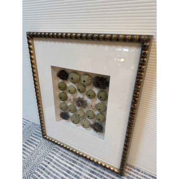 Design Plus Gallery presents a Shadow Box of Sea Urchins. The beautiful, carved and gilt finished frame is a foil to the collection of naturally beautiful collection of bristly and delicate creatures. Protected by glass. Condition is good.