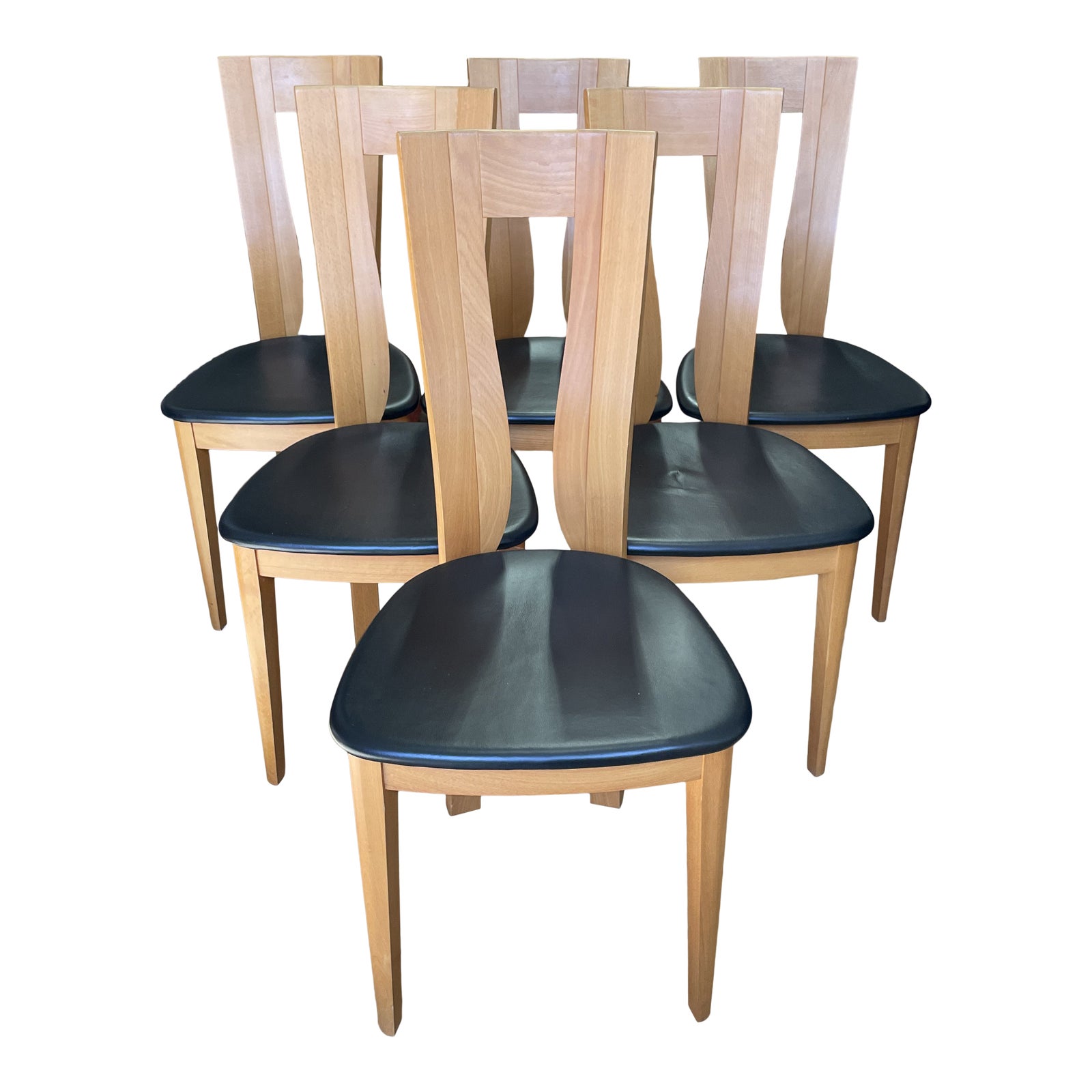 Design Plus Gallery presents a set of Six Antigua Dining Chairs by Seltz Furniture. A unique combination of beechwood and leather, craftsmen have created a slim but comfortable silhouette. Minor wear. Made in France.