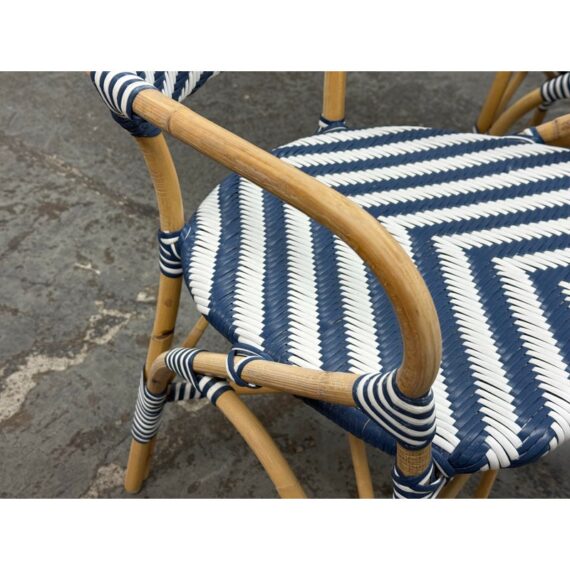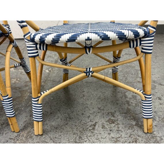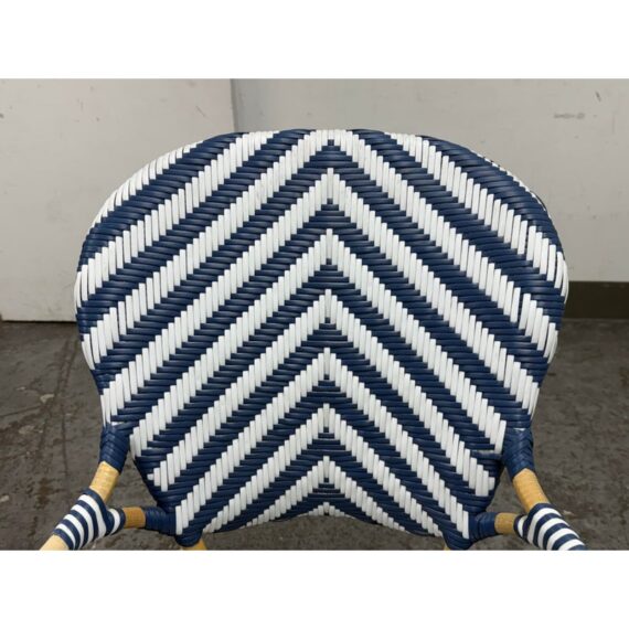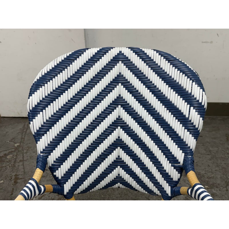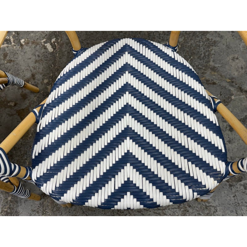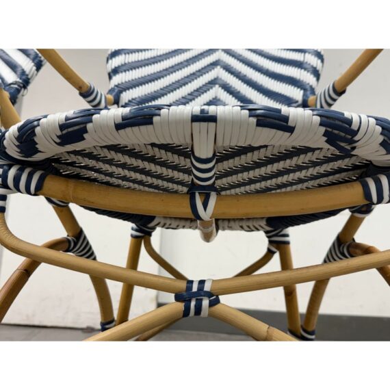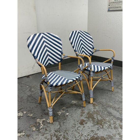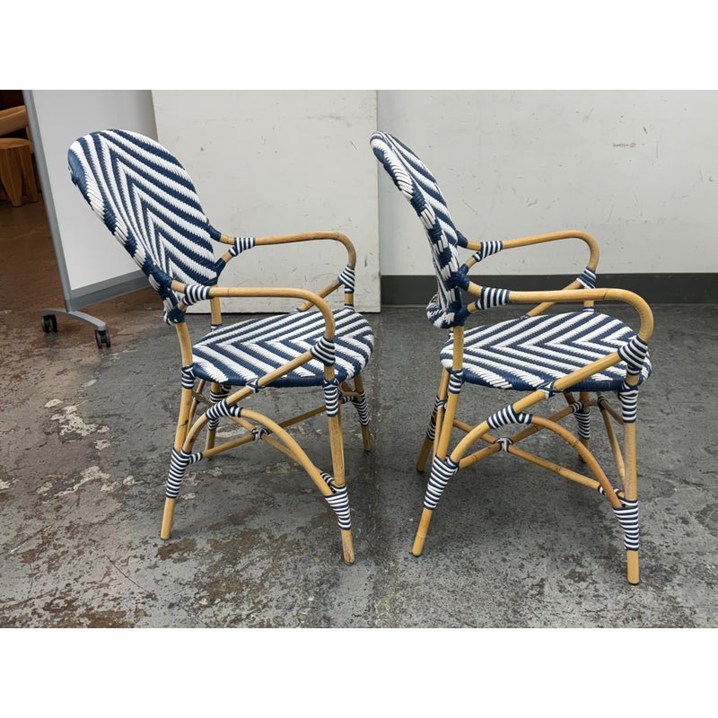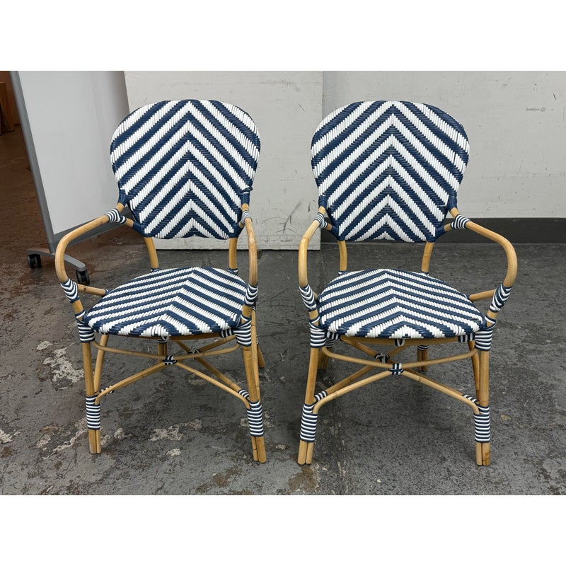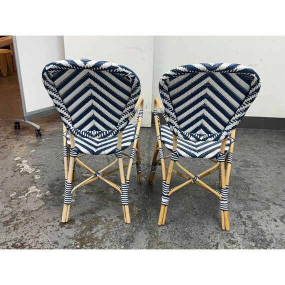 Design Plus Gallery presents a Pair of Chevron Riviera Side Chairs from Serena & Lily. The set is inspired by classic 1930s European bistro piece and reinterpret to elevate them to new heights. They are handcrafted with sustainable rattan and woven plastic seats, great for the kitchen or the patio. They are all in good condition for their usage.