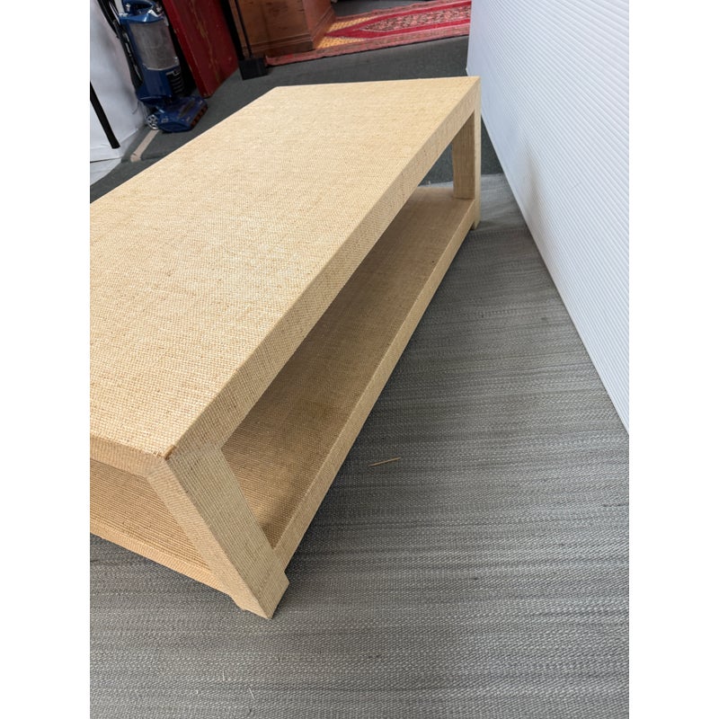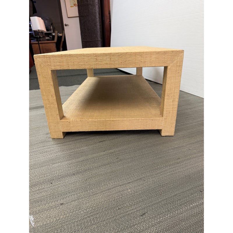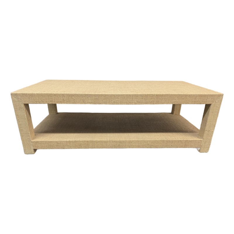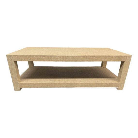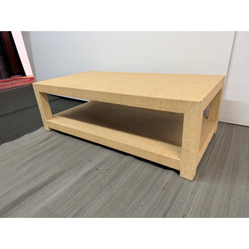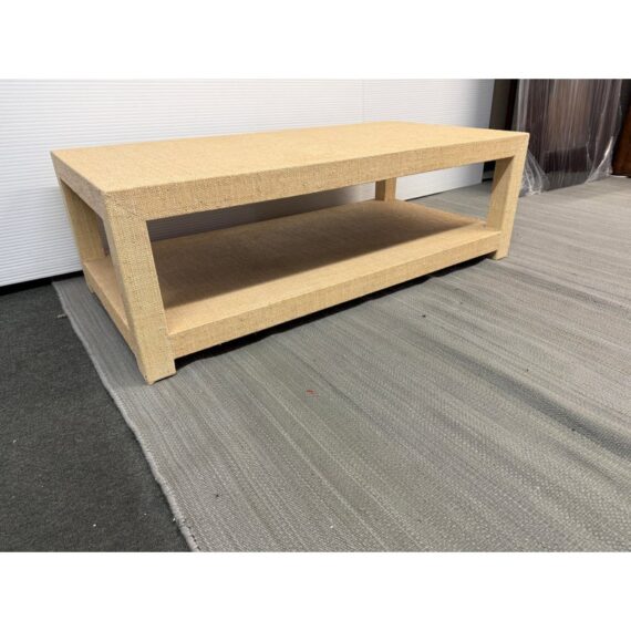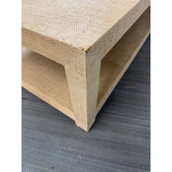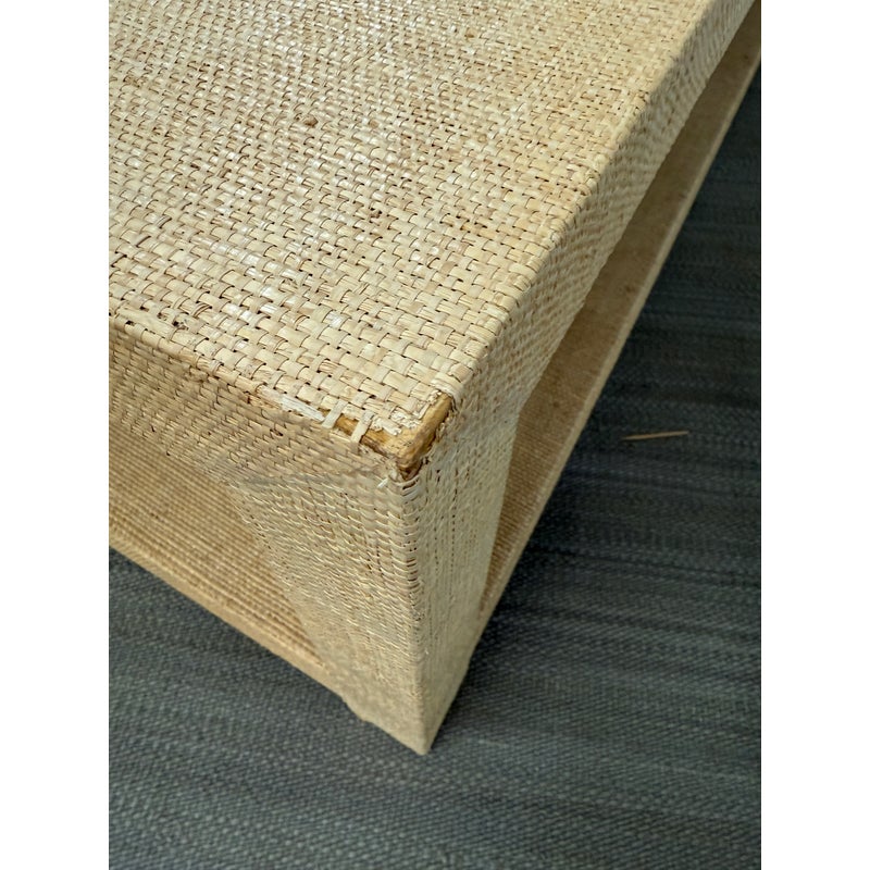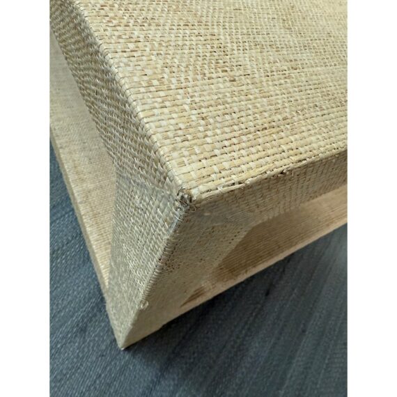 Design Plus Gallery presents the Driftway Accent Table by Serena & Lily. A beautifully simple silhouette in solid wood that is hand wrapped in painted linen then protected with matte lacquer finish. Lovely display surface above, wide and tall display or storage below. Scaled to complement many spaces in your home. Missing raffia on corners; condition is fair for age and use.