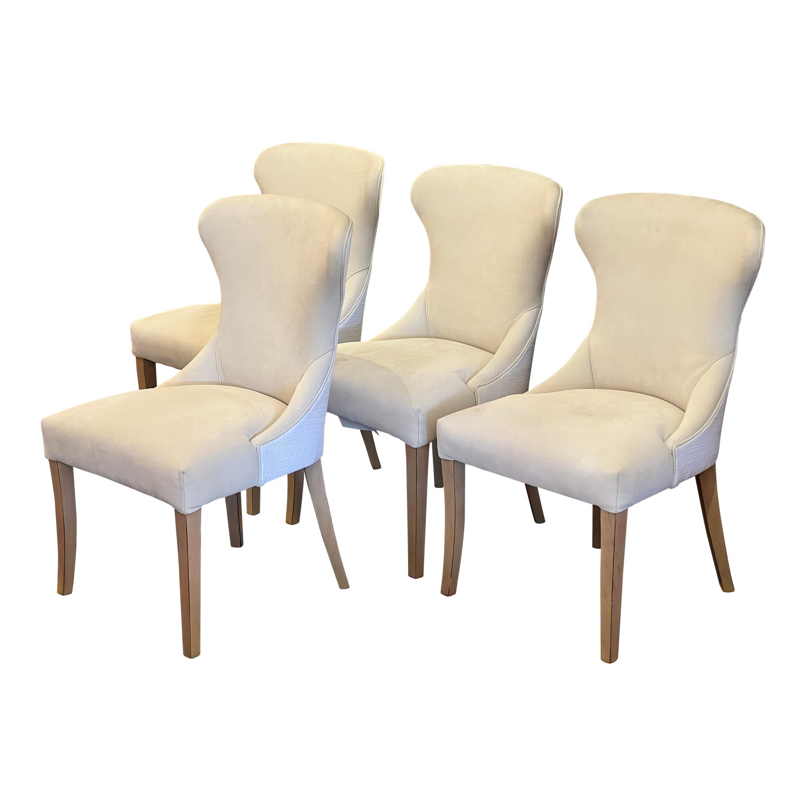 Design Plus Gallery presents a Set of Four Grace Dining Chairs from Serena & Lily. These chairs blend classic with contemporary due to its unadorned but elegant profile. Available here in a luxe Ivory Suede + Cream Linen upholstery with nearly monochrome driftwood finish legs. Each chair is handmade by skilled artisans using only the best materials, they are destined to remain a favorite for years to come. A few discolorations are found on the seat of a few chairs, soiling.