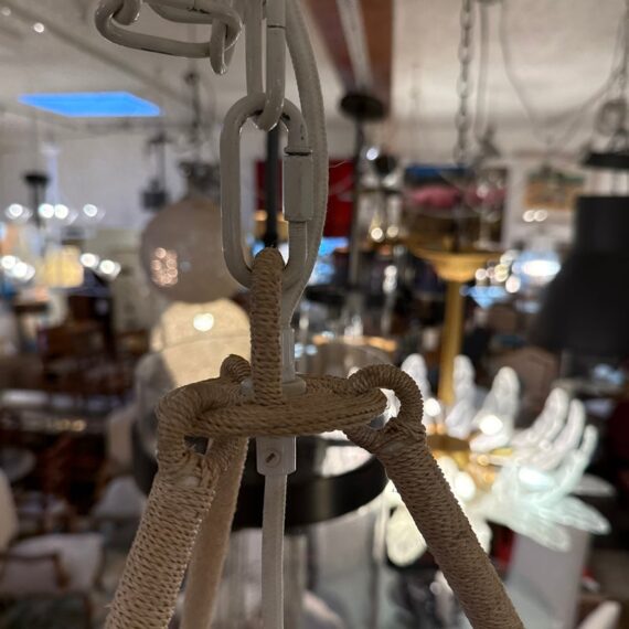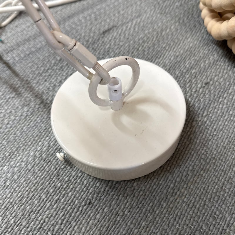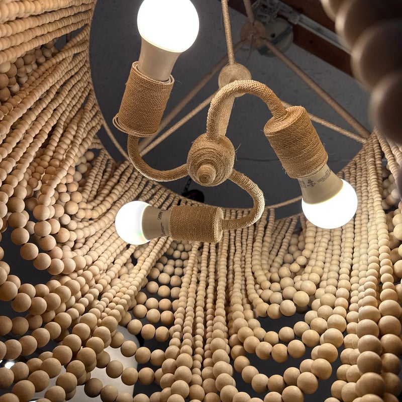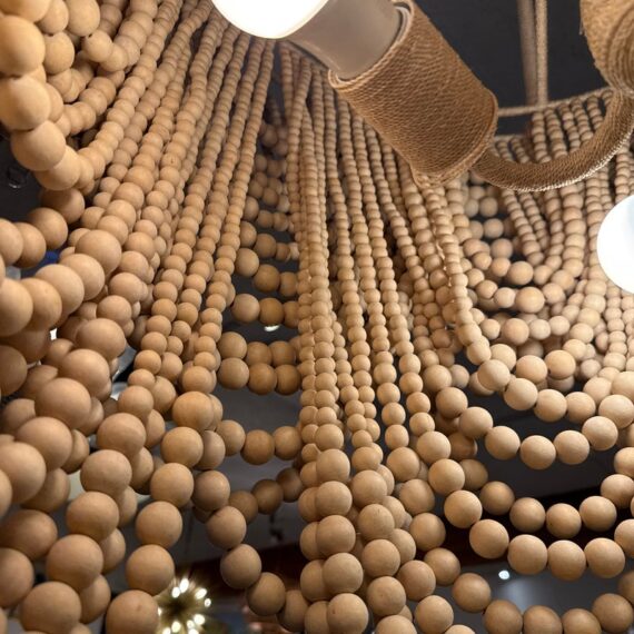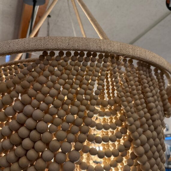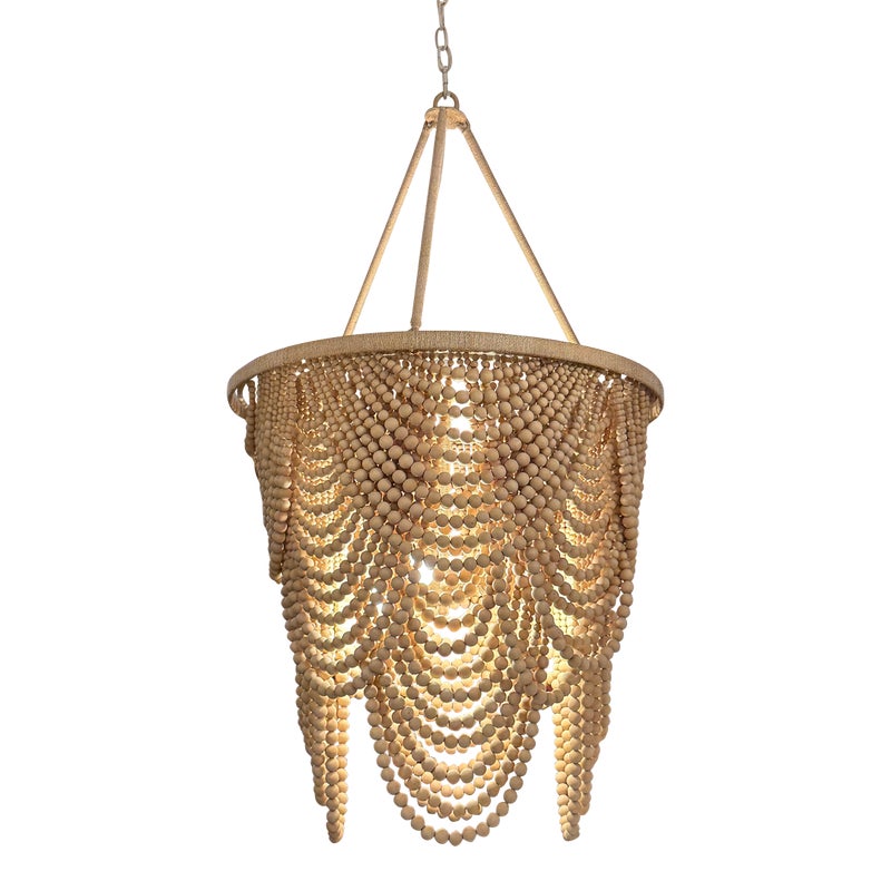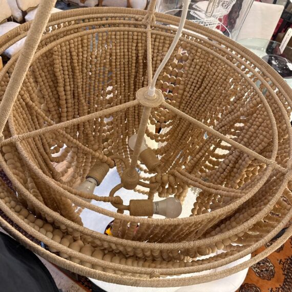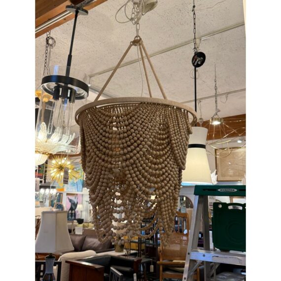 Design Plus Gallery presents the Larimar Pendant from Serena & Lily. Drum up your décor with this Organic Modern pendant the will up you California Coastal vibe. It has stately wood and coco beaded shades that descend in drama. Each tier is lined with linen to diffuse the light peaking through. Grab it while you can as the brand no longer produces this pendant and it is in good condition for its usage.