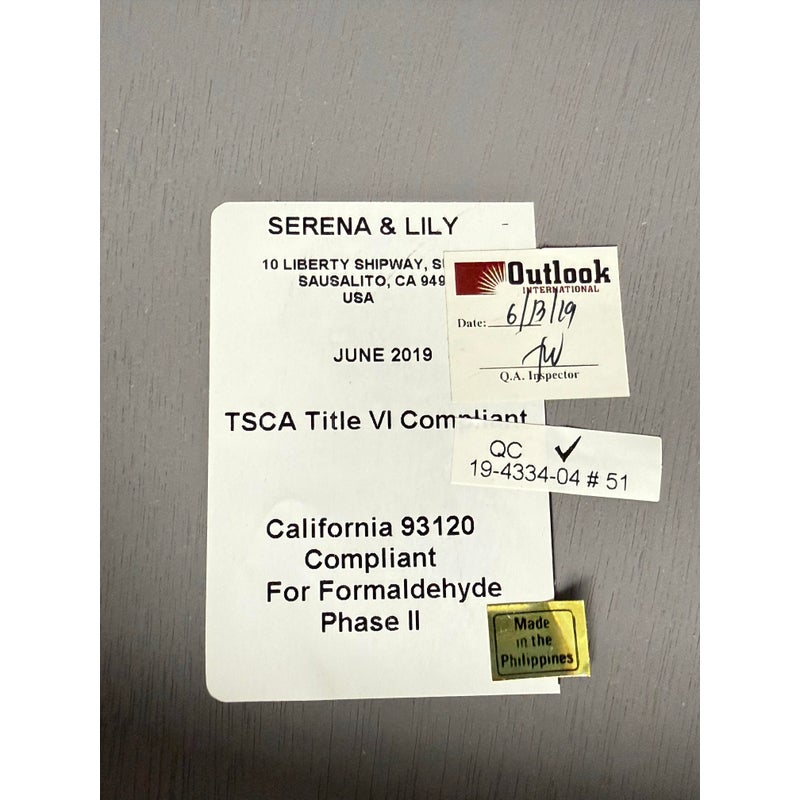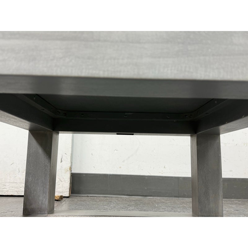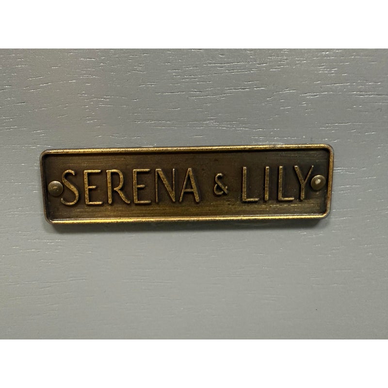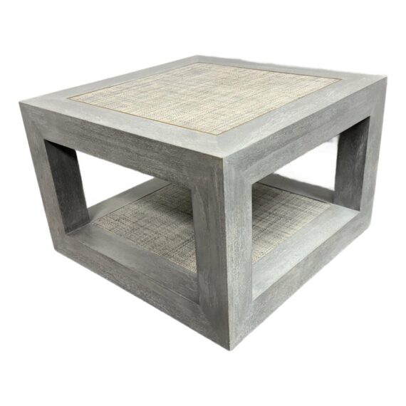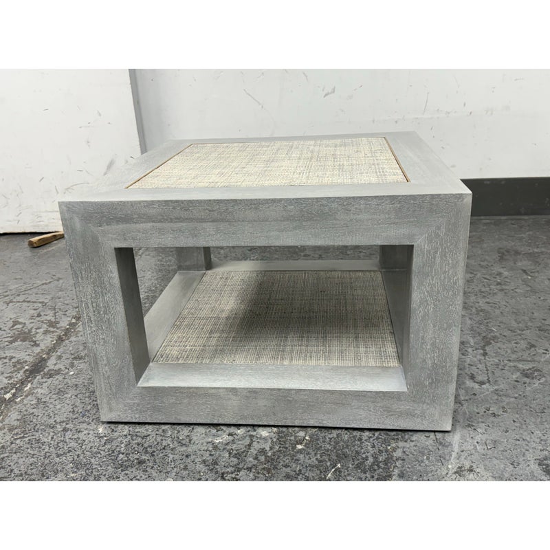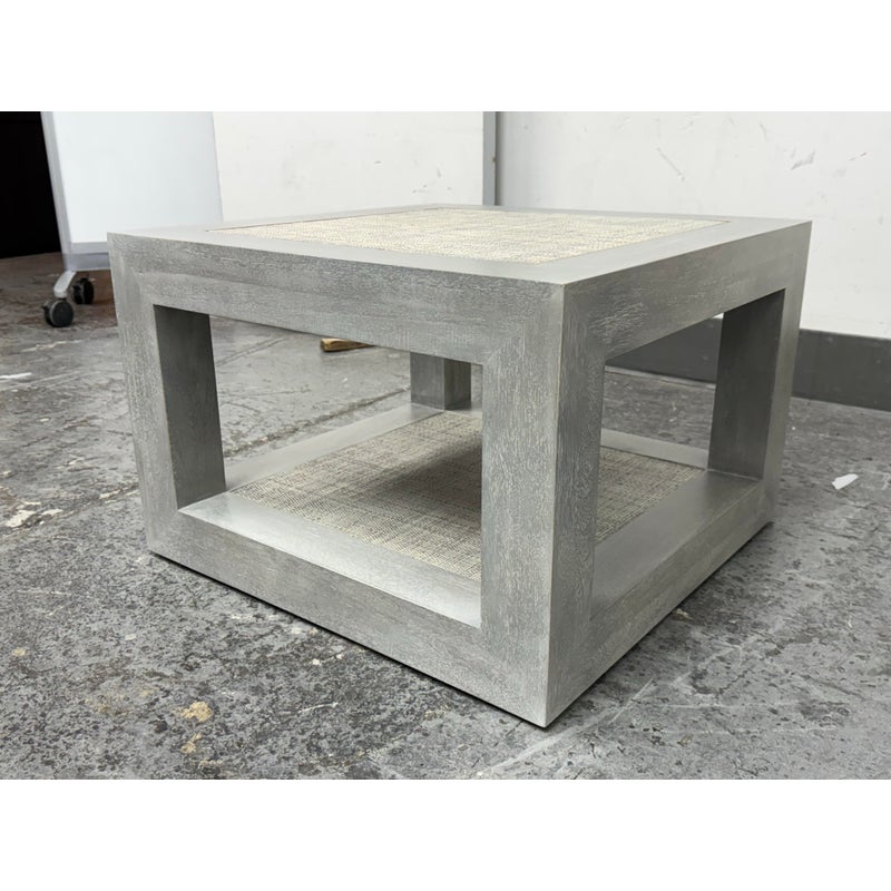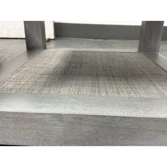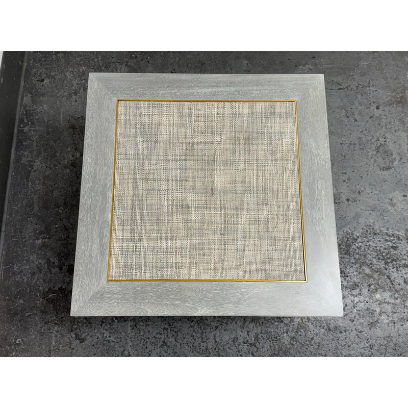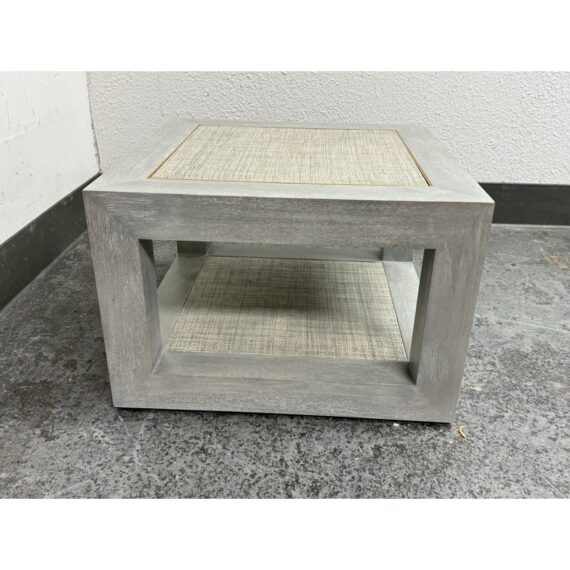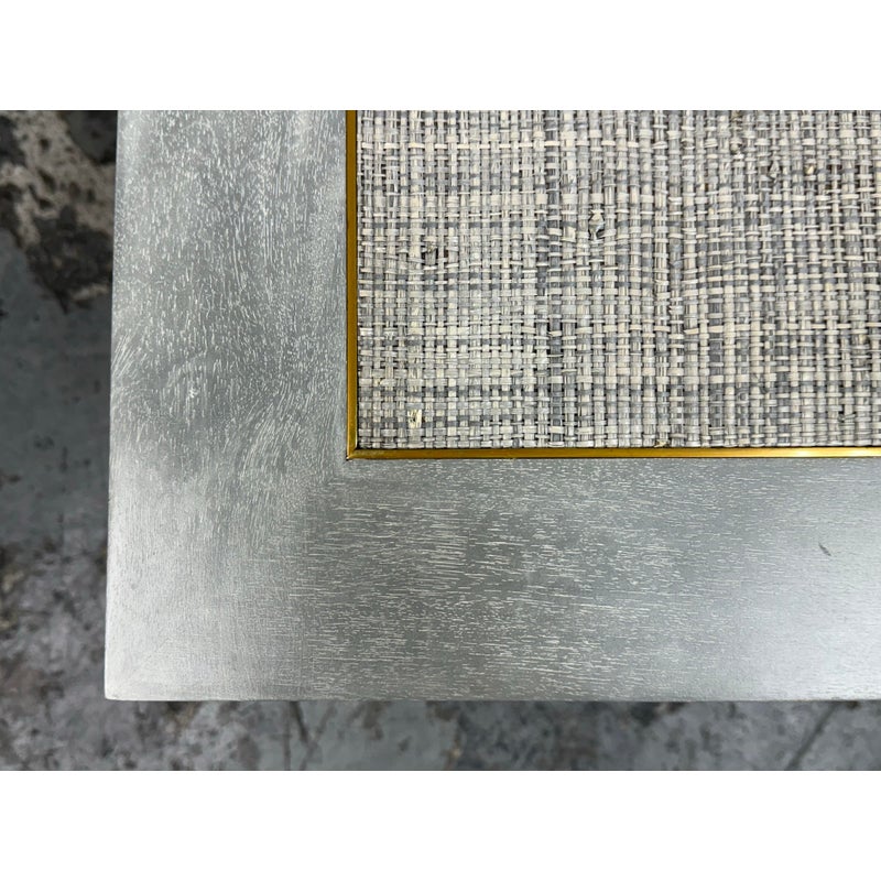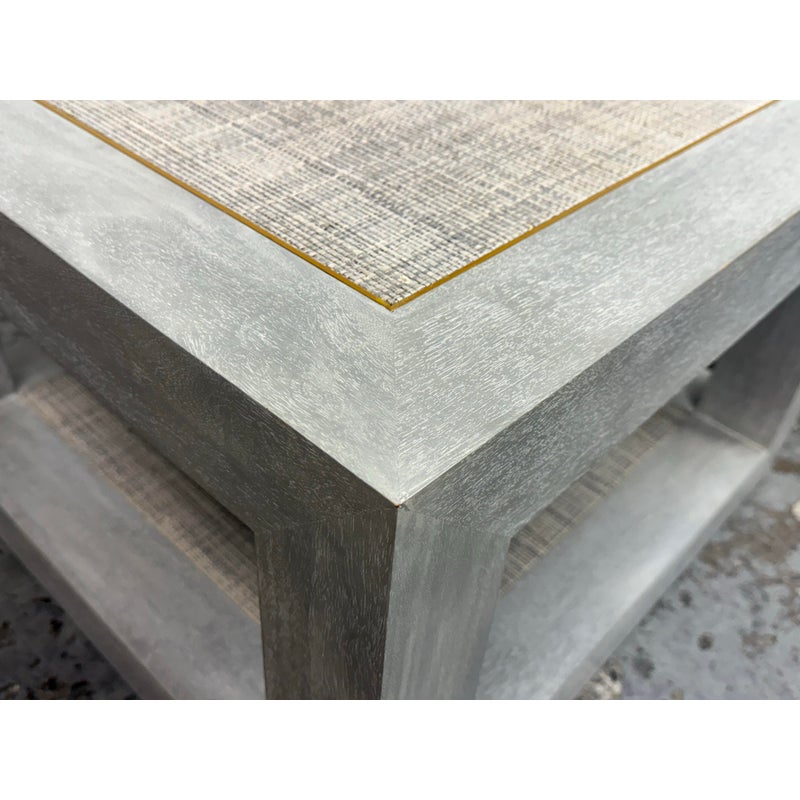 Design Plus Gallery presents a Mercer Side Table from Serena & Lily. Grand in scale with sleek lines and relaxed texture, handwoven natural raffia panel inset in a Parsons-inspired square frame, and trimmed in brass. Finished in neutral gray/white tones with a durable clear lacquer. Broad lower shelf for display and storage. Light evidence of surface wear; overall good condition.