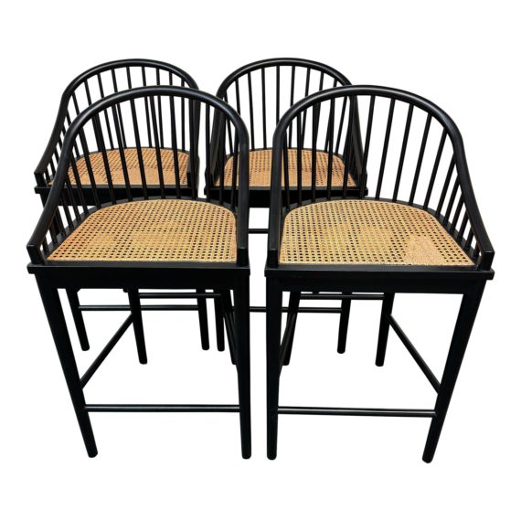 Design Plus Gallery presents a Set of Four Millbrook Counter Stools by Serena & Lily. Referencing classic spindled, Windsor chairs are crafted in a combination of black matte beech and handwoven natural cane. A lovely update to an old favorite. Light evidence of surface wear; condition is good for age and use.