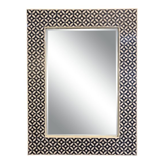 Design Plus Gallery presents a Portland Bone Inlay Mirror by Serena & lily. A resin with bone veneer finish. Hangs vertically or horizontally. D-rings attached for mounting. The colors are Ivory and Blue Color. Minor cracking a few inlays. Made in India.