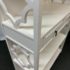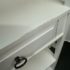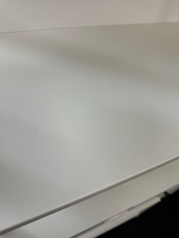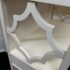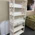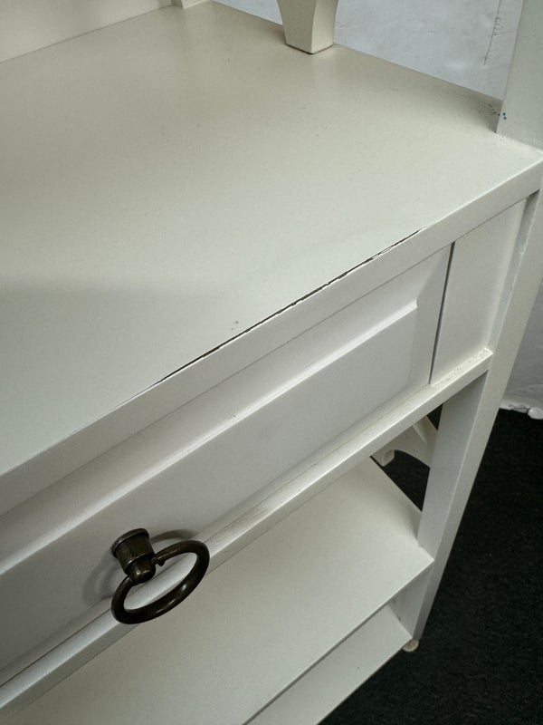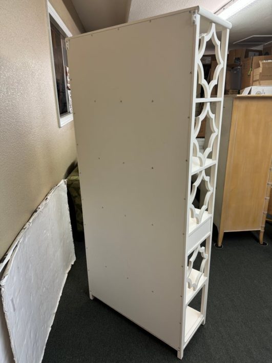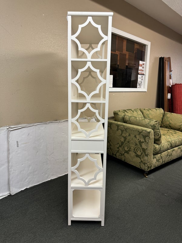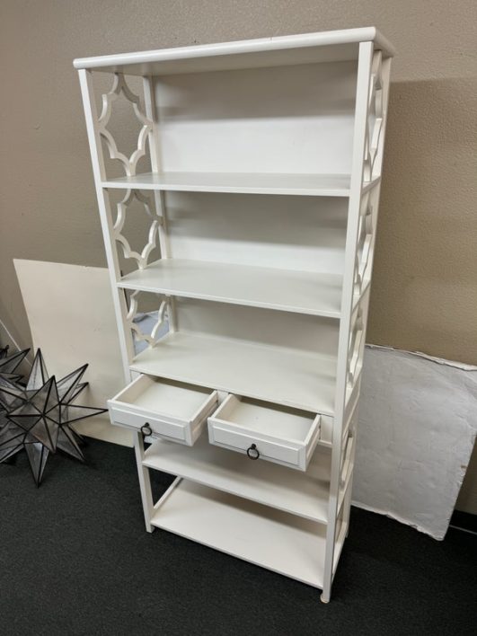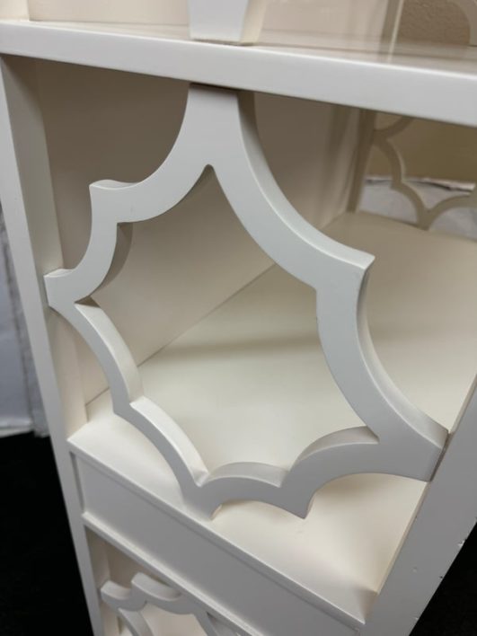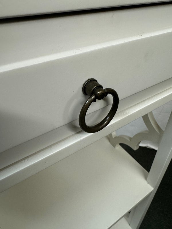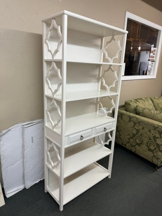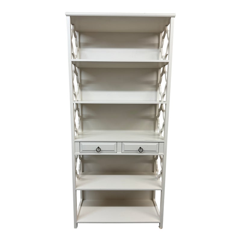 Design Plus Gallery presents a Regency Bookcase by Serena & Lily. Scaled beautifully with great function, the white lacquered shelf is an elegant storage and display piece. Soft matte white finish lets the side cutouts be the show. Bronze finished drawer pulls. Light surface wear (see over drawer), consistent with age and use.