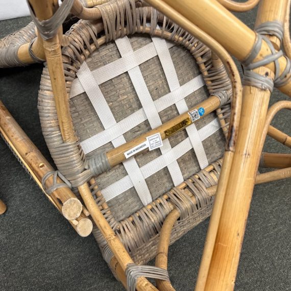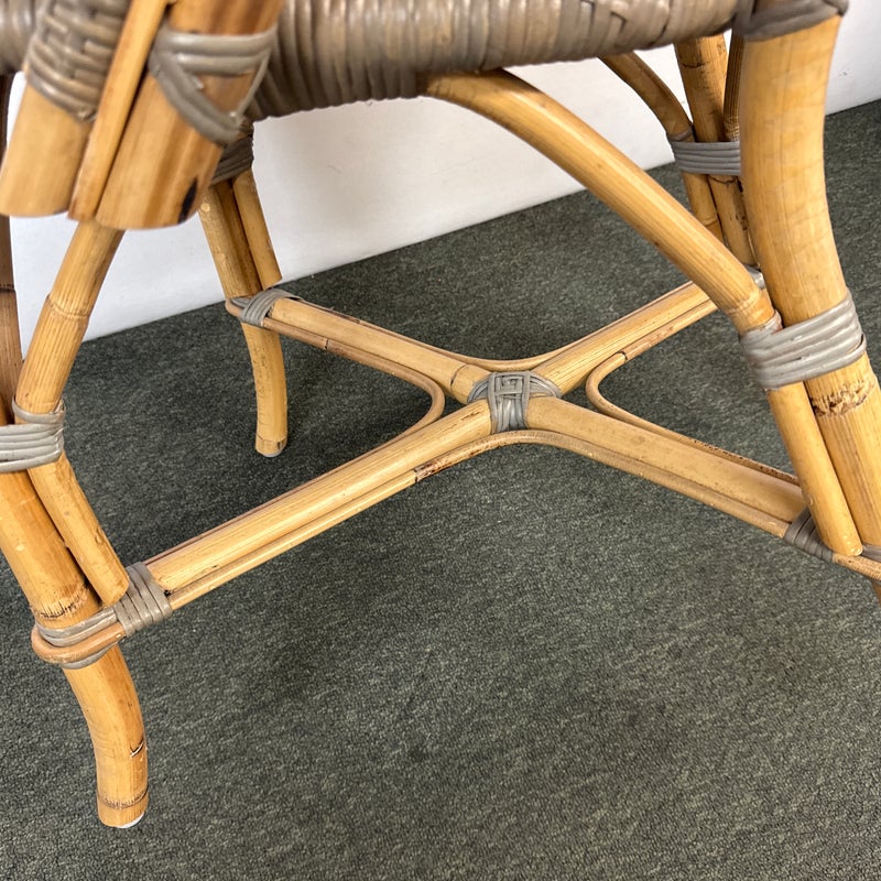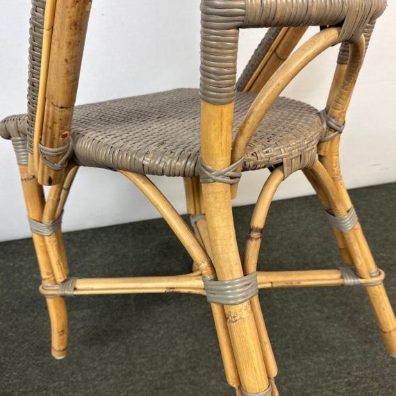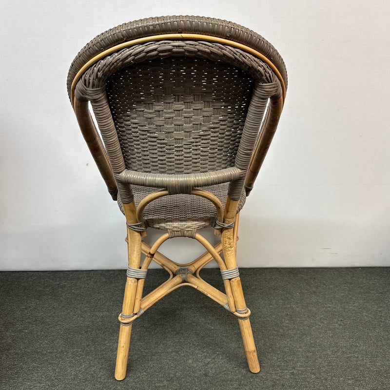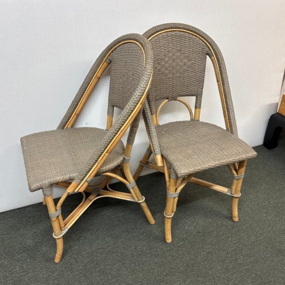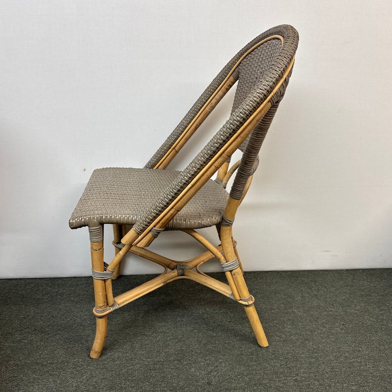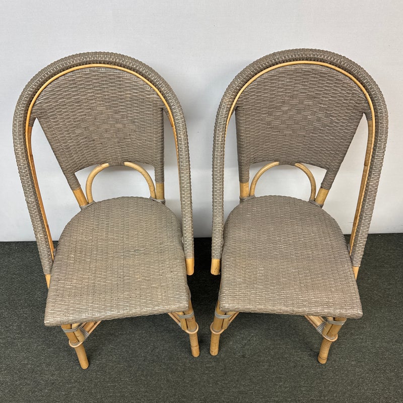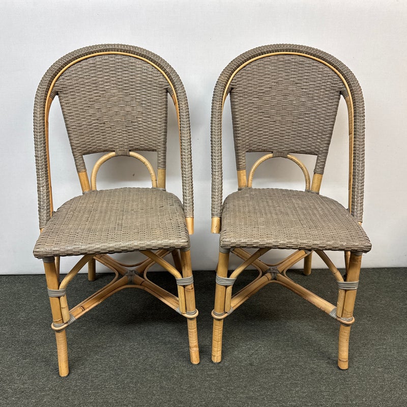 Design Plus Gallery presents a Pair of Riviera Side Chairs by Serena and Lily. Referencing a distinct Parish Bistro aesthetic, each frame is crafted of sturdy natural bamboo that is then woven with gray stained rattan. Light weight and easy to move where needed. Light surface wear; condition is good for age and use.