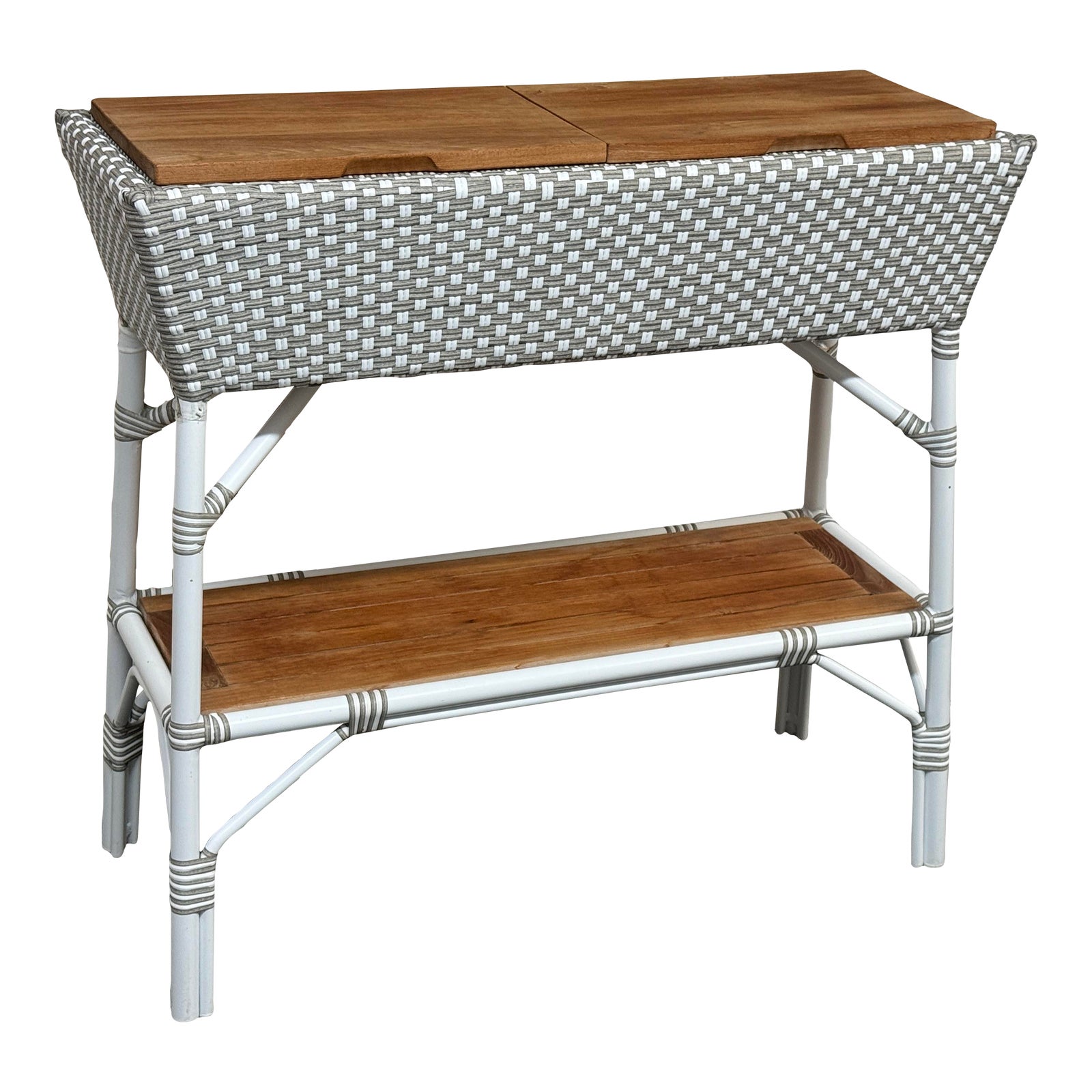 Design Plus Gallery presents the Riviera Bar by Serena & Lily. A lovely homage to the iconic style found in Parisian bistro chairs, this Bar can be enjoyed indoors our outdoors. The weather-friendly aluminum is wrapped in all-weather resin “wicker” that is designed to be weather resistant, featuring galvanized bins with removable teak lids. The functional companion to Serena & Lily’s iconic Riviera Collection, your beverages will be kept at the ready with storage provided on lower shelf. Little evidence of wear; condition is good for age and use.