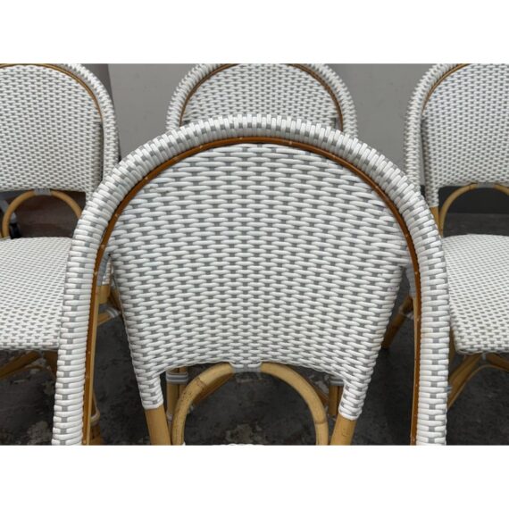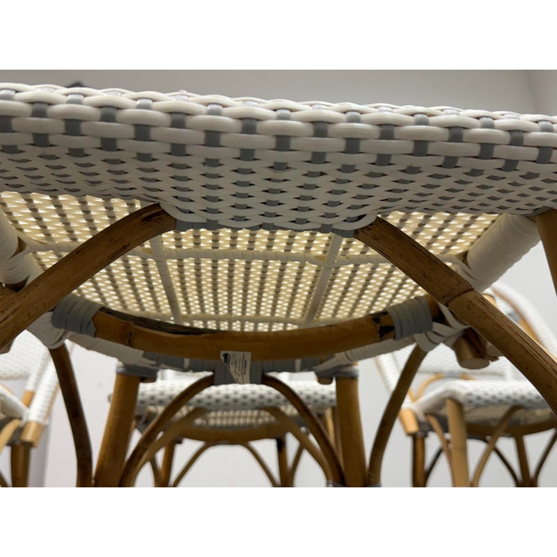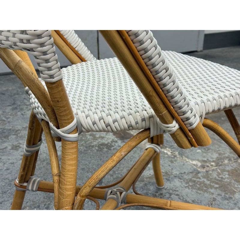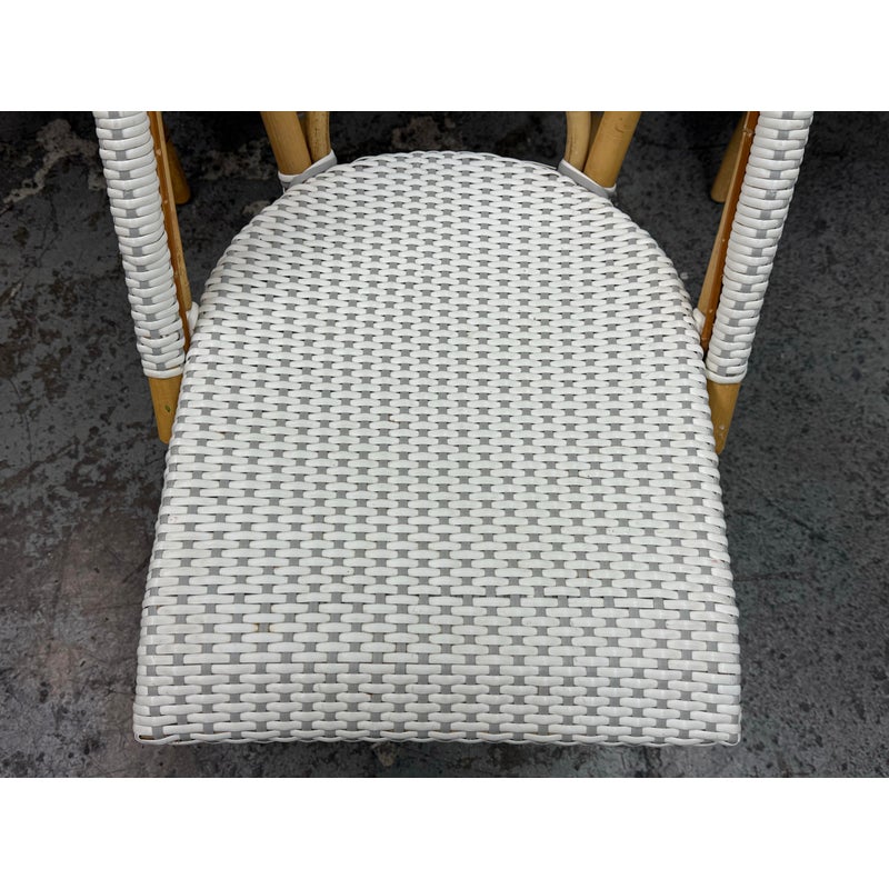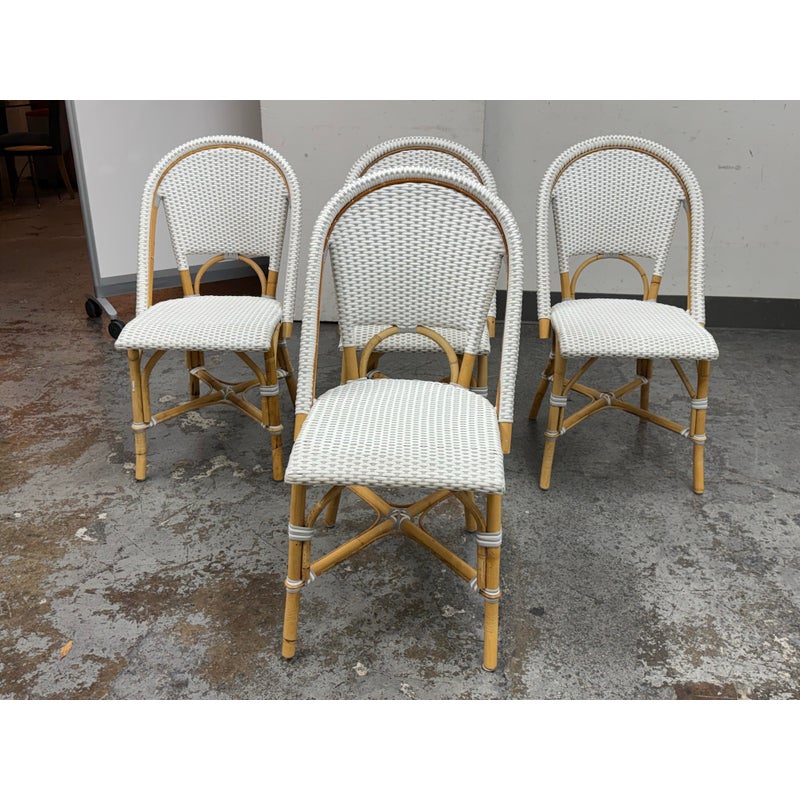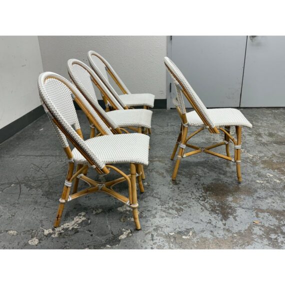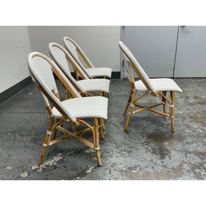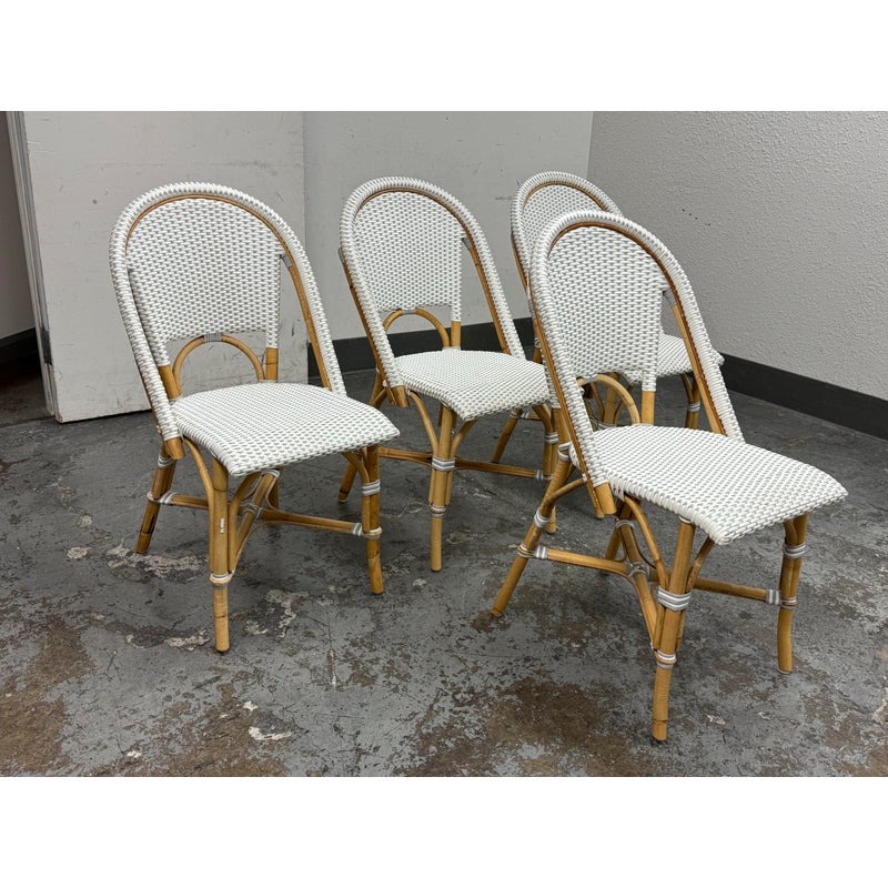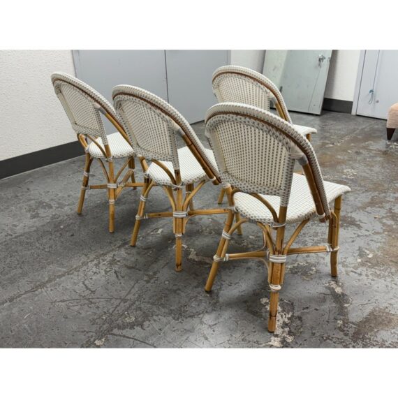 Design Plus Gallery presents a Set of Four Riviera Side Chairs from Serena & Lily. The style of chairs are nspired by the iconic silhouette of the Parisian bistro seats, every rattan frame is bent and shaped by hand. Each bears marks of distinction — from harvest, an artisan touch, and nature’s material maturing in time. This set is in white with tan frame and are all in good condition for their usage.