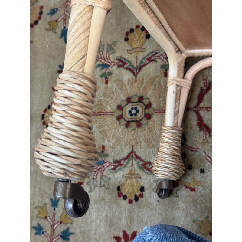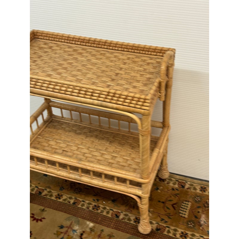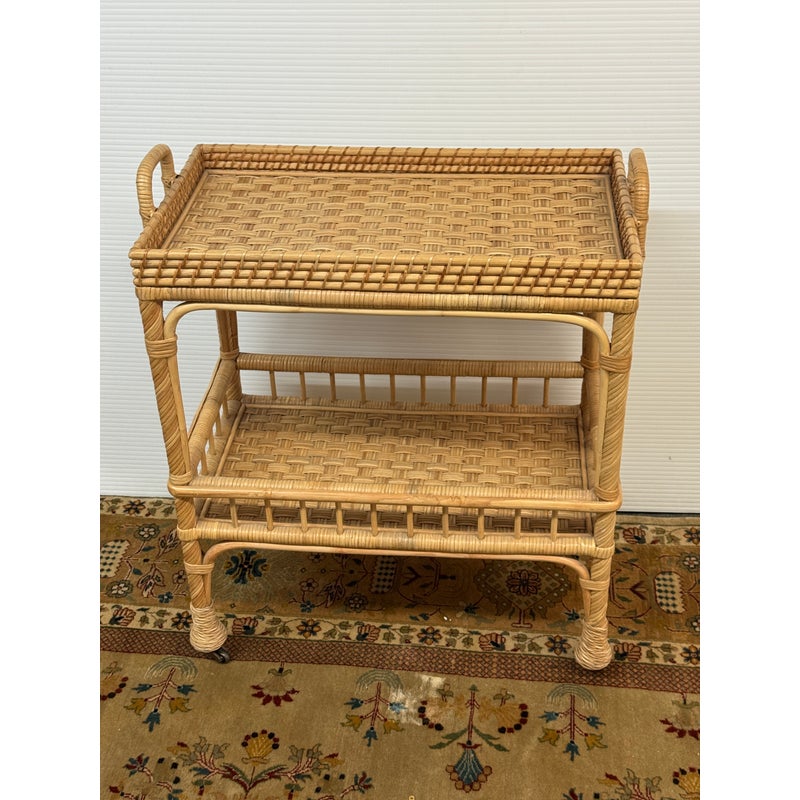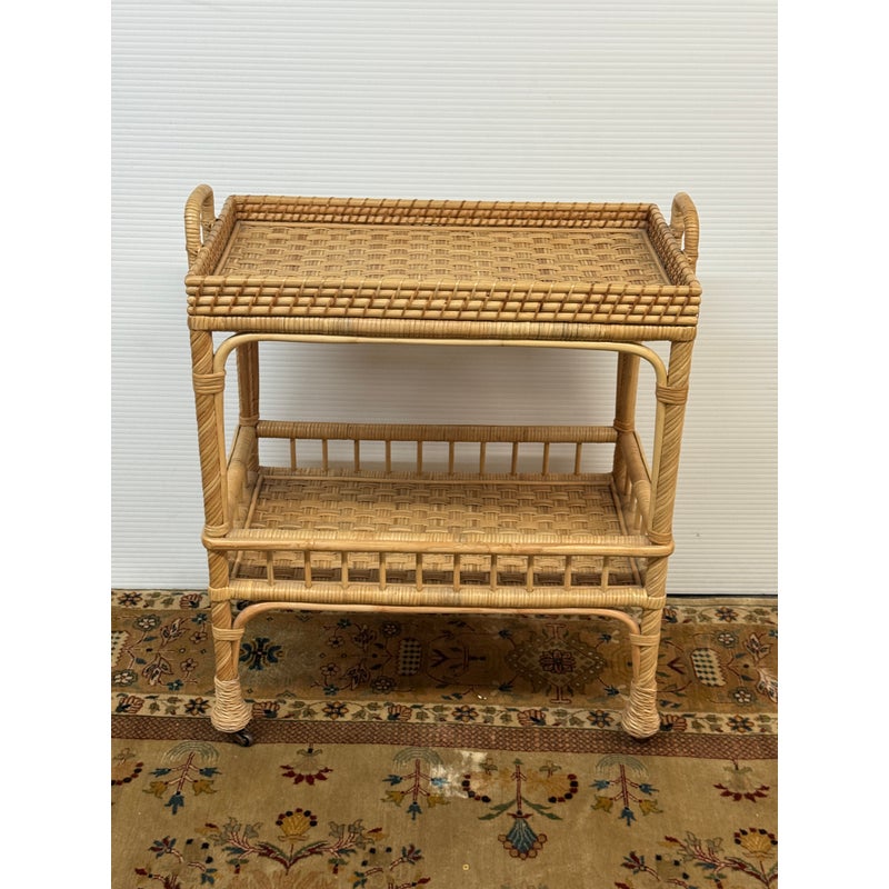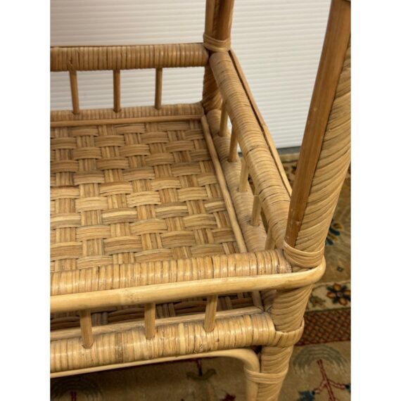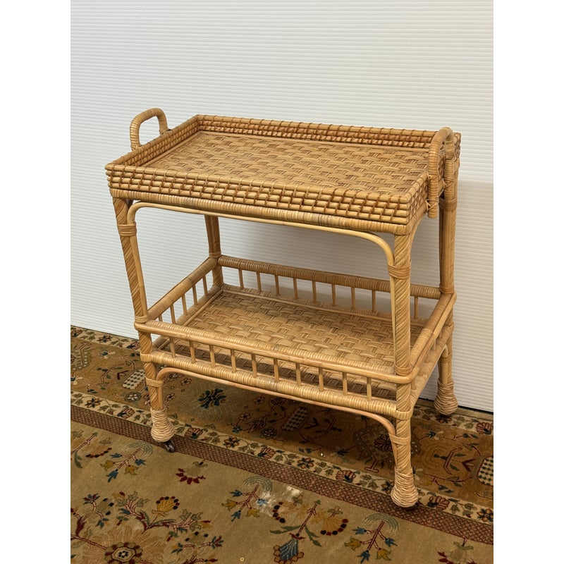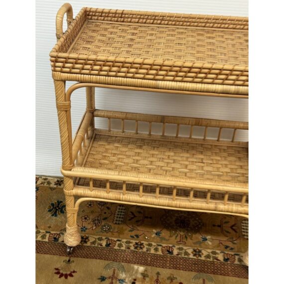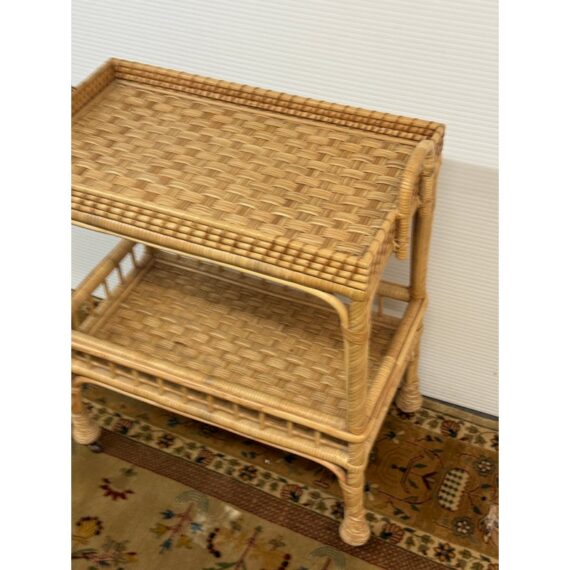Design Plus Gallery presents a South Seas Rattan Side Cart from Serena & Lily. The side car will raise the bar at happy hour with this petite textural beauty that boasts double levels of display space to showcase bottles, shakers, and accoutrements. It’s ready to roll into any room with its smooth brass casters. Park it bedside as a nightstand to store books and baubles. Or create an entry way console featuring fresh florals and collected treasures. It is in good overall condition for its usage.