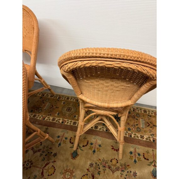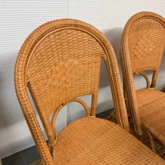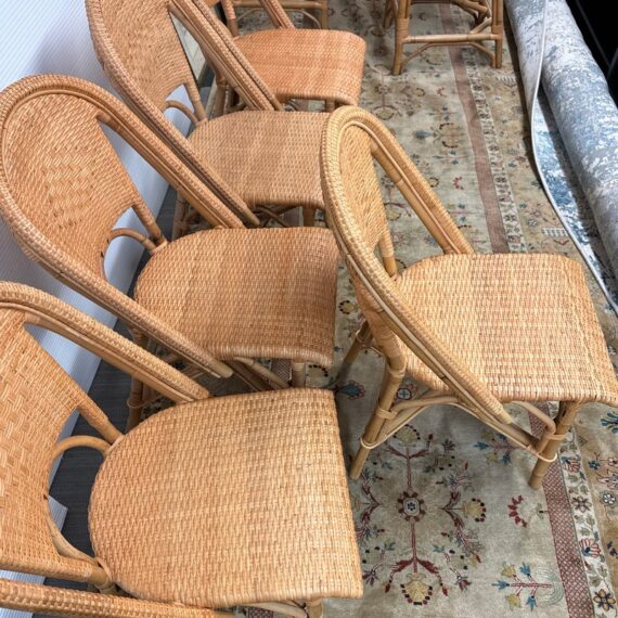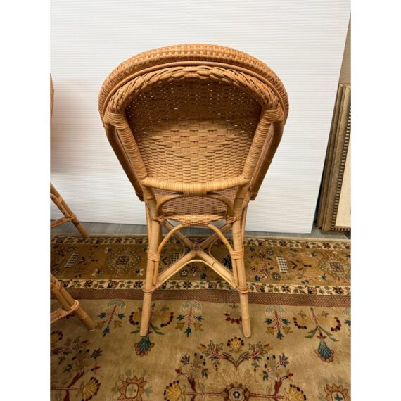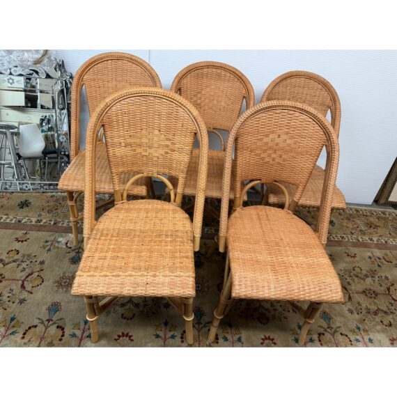 Design Plus Gallery presents a Set of Five Natural Sunwashed Rivera Rattan Dining Chairs from Serena & Lily. These chairs are inspired by the iconic silhouette of the Parisian bistro seats. Every rattan frame is bent and shaped by hand and each bears a mark of distinction — from harvest, an artisan touch, and nature’s material maturing in time. They are in their natural tone without treatment called Natural. The show minor signs of wear from use and are in good condition.