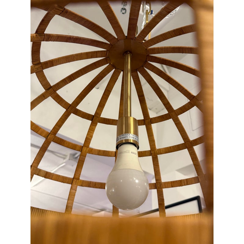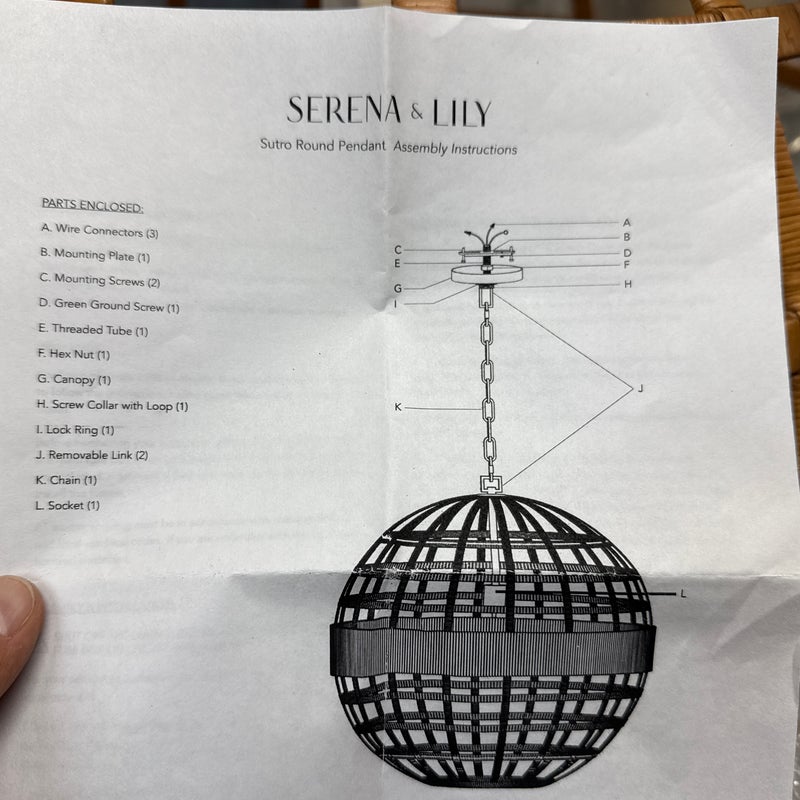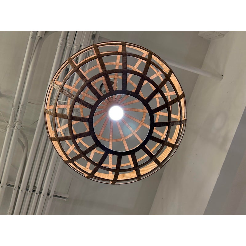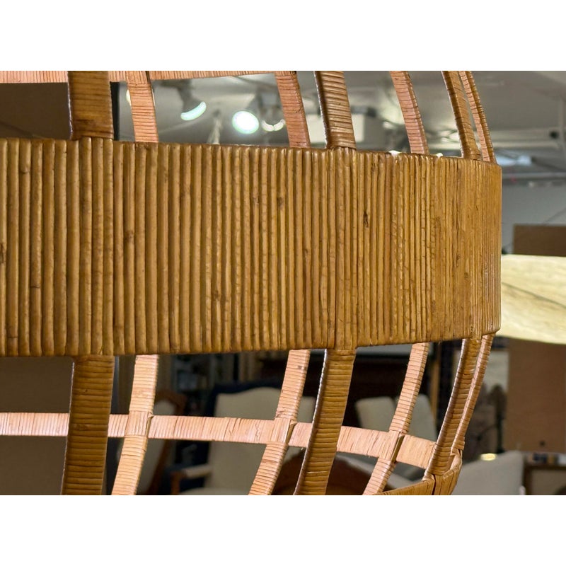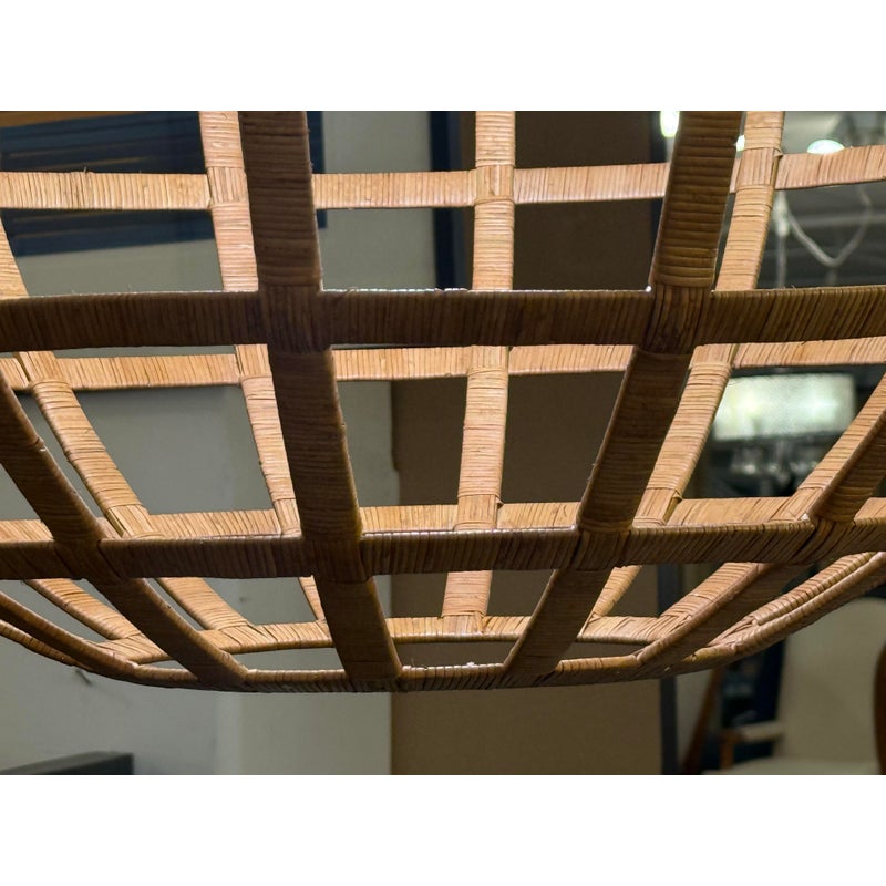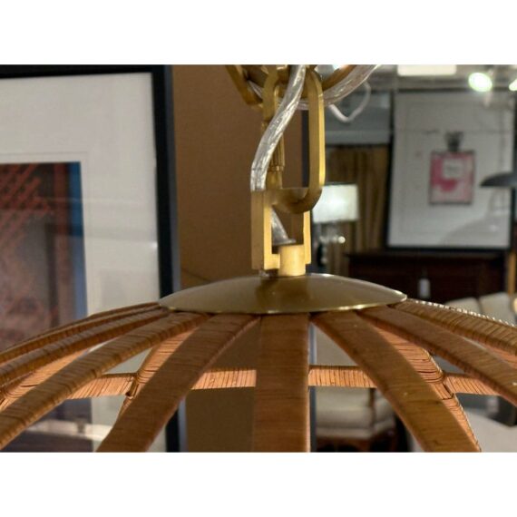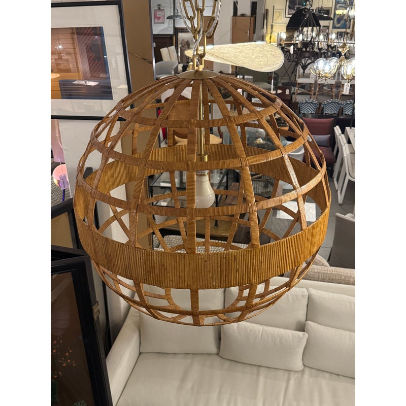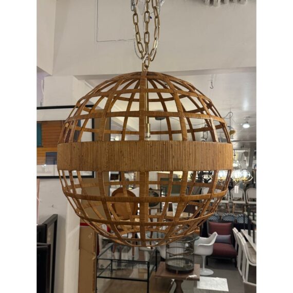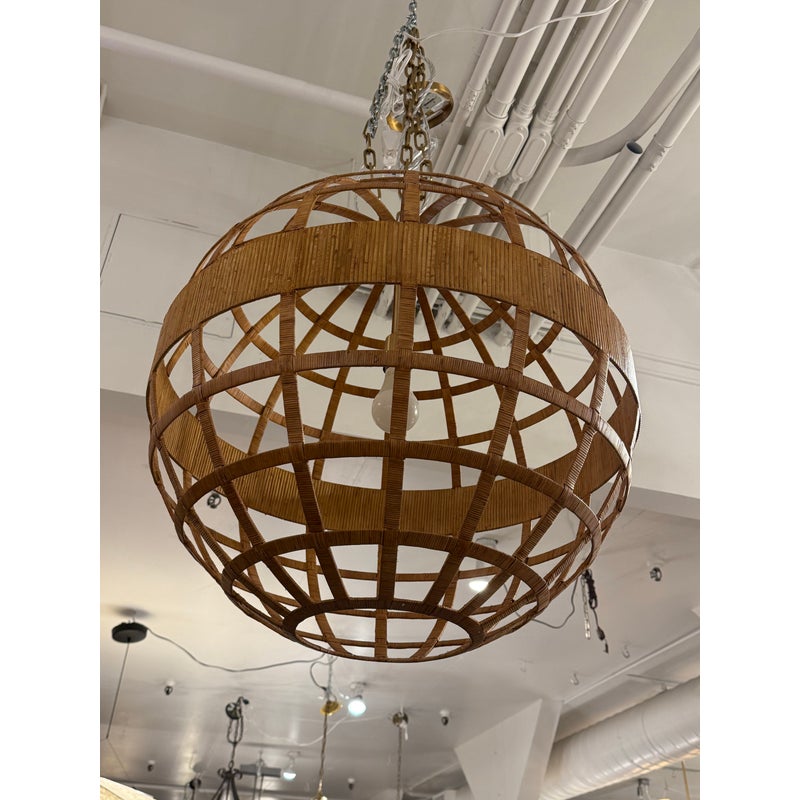 Design Plus Gallery presents the Sutro Rattan Pendant from Serena & Lily. This pendant is in the same design style that Serena & Lily is synonymous with : California Coastal with an Organic Modern vibe. Hand-wrapped rattan circumnavigates the latitudes and longitudes of the frame, creating a globe like presence with a thick, banded wrap around its ‘equator’. Get it while you can as this style is no longer in production with the brand. It is in good condition with wear that is consistent with its usage.
