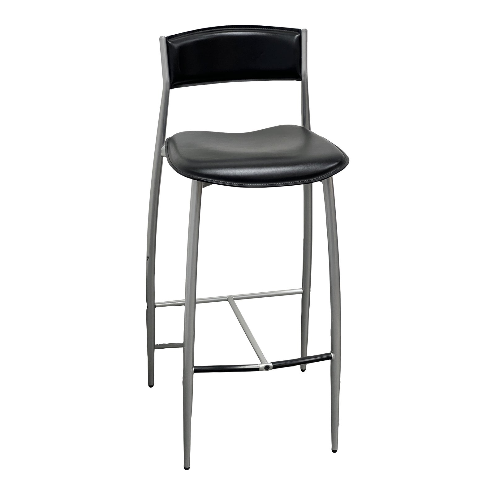 Design Plus Gallery presents a Altek Baba Italian barstool. The Baba Collection was designed by Sergio Mian. Slanted edge seat and reinforced footrest makes this black leather + aluminum finish frame comfortable to sit on enjoyable to look at. Add some Italian class and comfort to your lounge High table, kitchen island, or private bar. Minor wear from usage. Made in Italy.