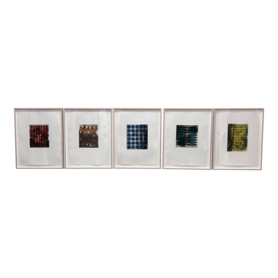 Design Plus Gallery presents a Seriagraph Set of Five Prints of Abstract Collage Artwork. These are identically framed and matted for a cohesive look. Each serigraph has an image of black and white trees with a superimposed graphic of geometric shapes with color over. The set is in good condition, with K Kimpton Contemporary Art as their dealer. In good condition, wear consistent with age + use.