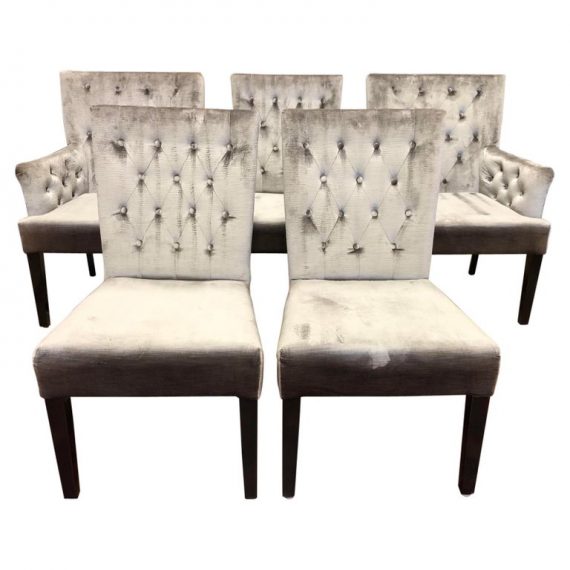 Design Plus Gallery presents a set of five Lola Chairs by Z-Gallerie. A classic and comfortable chair with luxurious deep button tufting which gives these chairs design unparalleled elegance. Heavy-gauge European rubber webbing provides durable and comfortable suspension. Solid birch hardwood legs with espresso finish. Double top stitched, upholstered in a silk velvet in a Champagne color. Visible wear on fabric. The set consist of two arm chairs with three side chairs. Arm Height: 26.5 inches, Seat Height: 18.5 inches