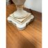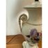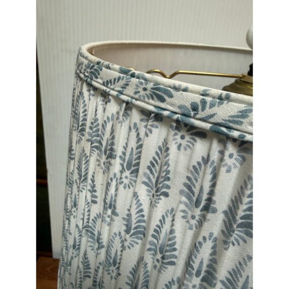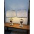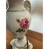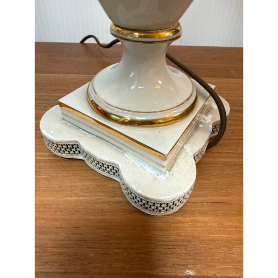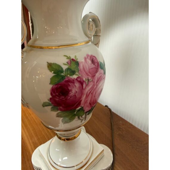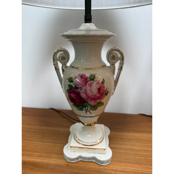Design Plus Gallery presents a Pair of Porcelain Floral Urn Shaped Table Lamps. These sweet lamps will warm up your bedroom with their feminine charm. They are bone toned ceramic with painted floral bouquets around the diameter of their urn shaped body. Gold details are found on the edging and there is a trim at the base that matches the blue floral print cotton shades. They are both in good condition for their usage.