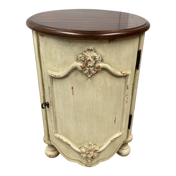 Design Plus Gallery presents a Shabby Chic Round Wood Side Table + Door. Distressed ivory paint gives an old world feel to the Traditional and French inspired carvings. Interior houses a single shelf. Top is contrasted with a warm chestnut stain, minor wear on surfaces.