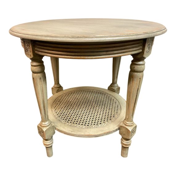 Design Plus Gallery presents a Shabby Chic Side Table. Patina painted with layers of color, the round table has a traditional style with cane shelf for storage. Visible wear.