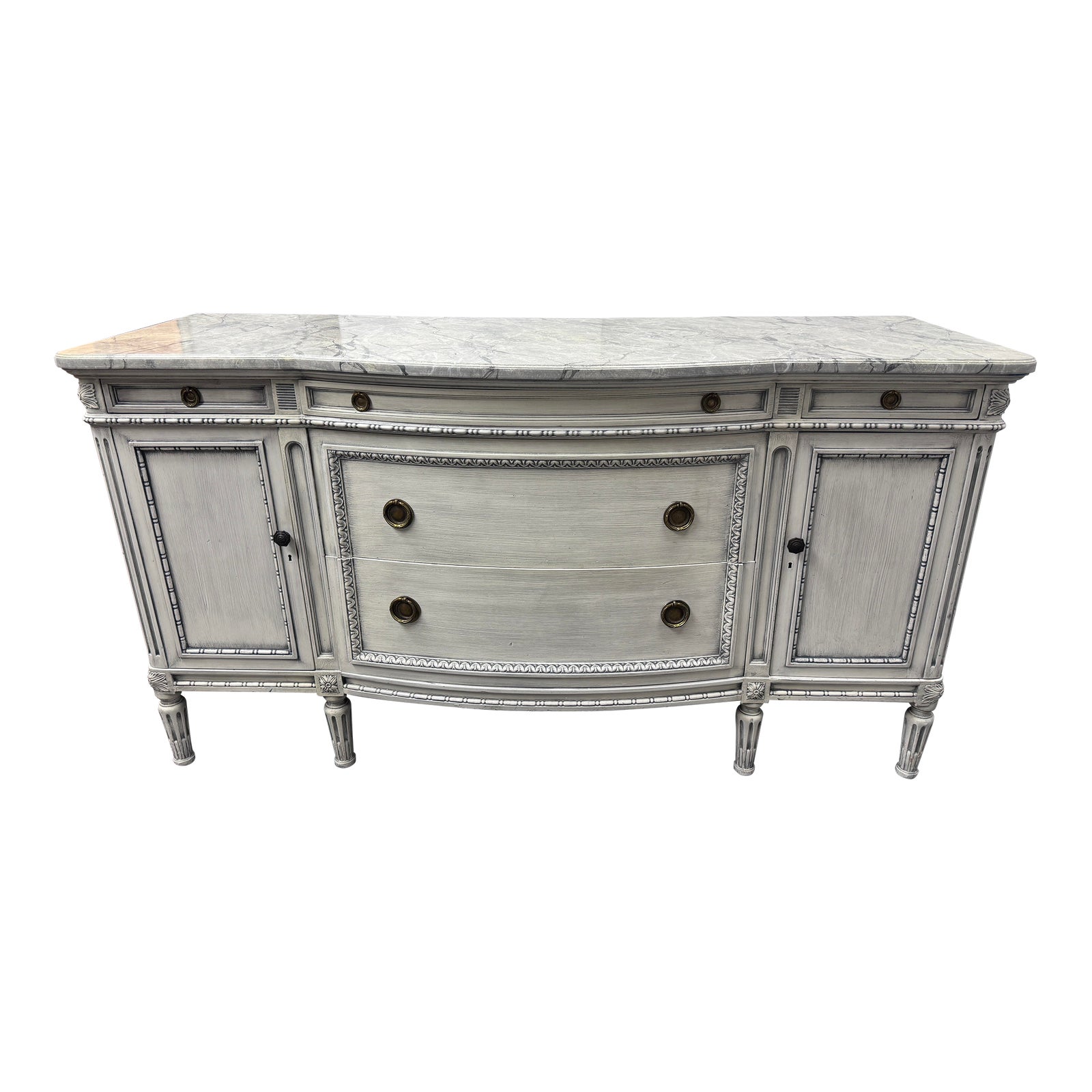 Design Plus Gallery presents a Shabby Chic Sideboard/Dresser. Faux Marble top displays elegance easily thanks to its vintage styling with the cabinet has an antiqued white finish. Interior storage includes three shallow drawers, two deep drawers, a cubby and three pull out trays. Antique brass drawer and door pulls. Interior set up allows use as sideboard or dresser. Does not come with a Key.