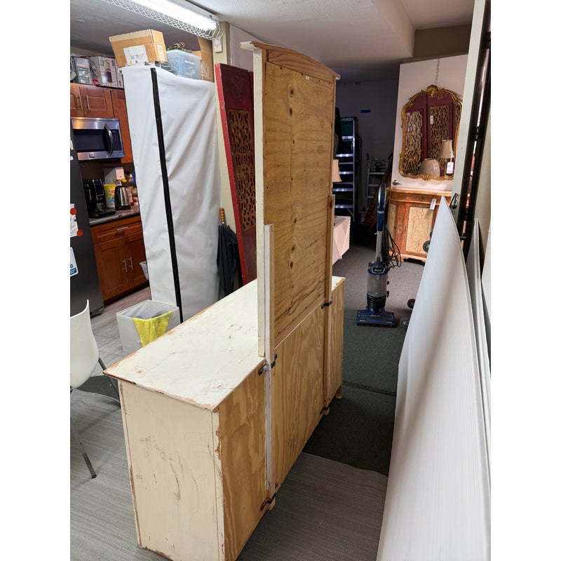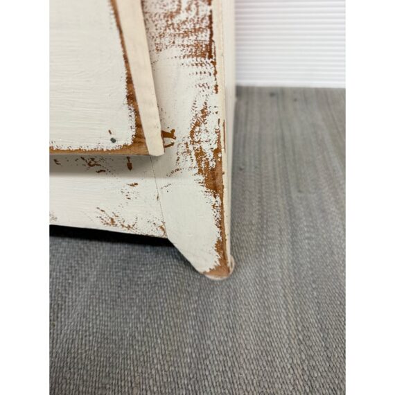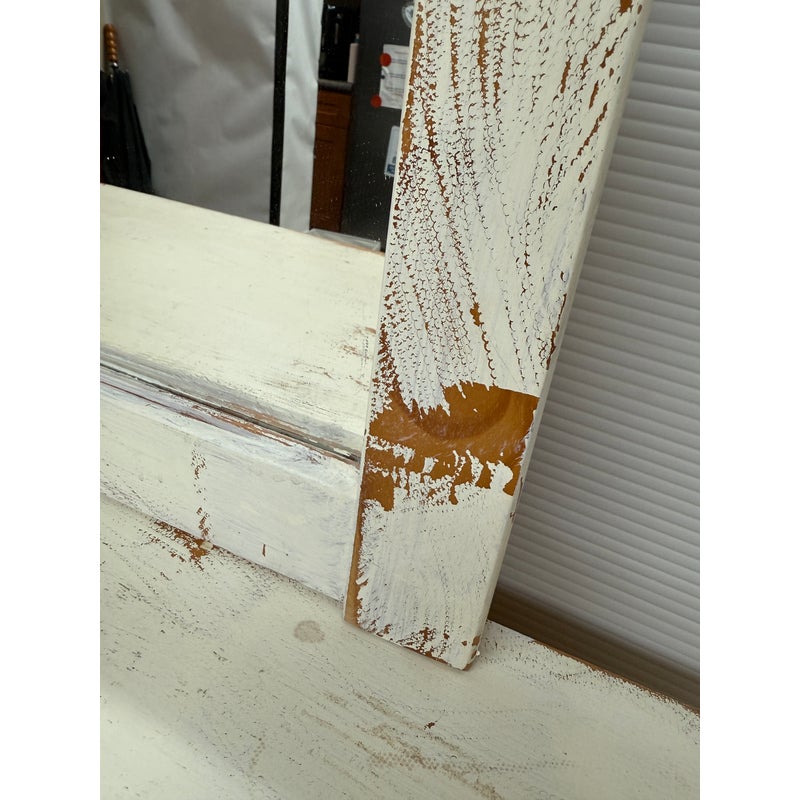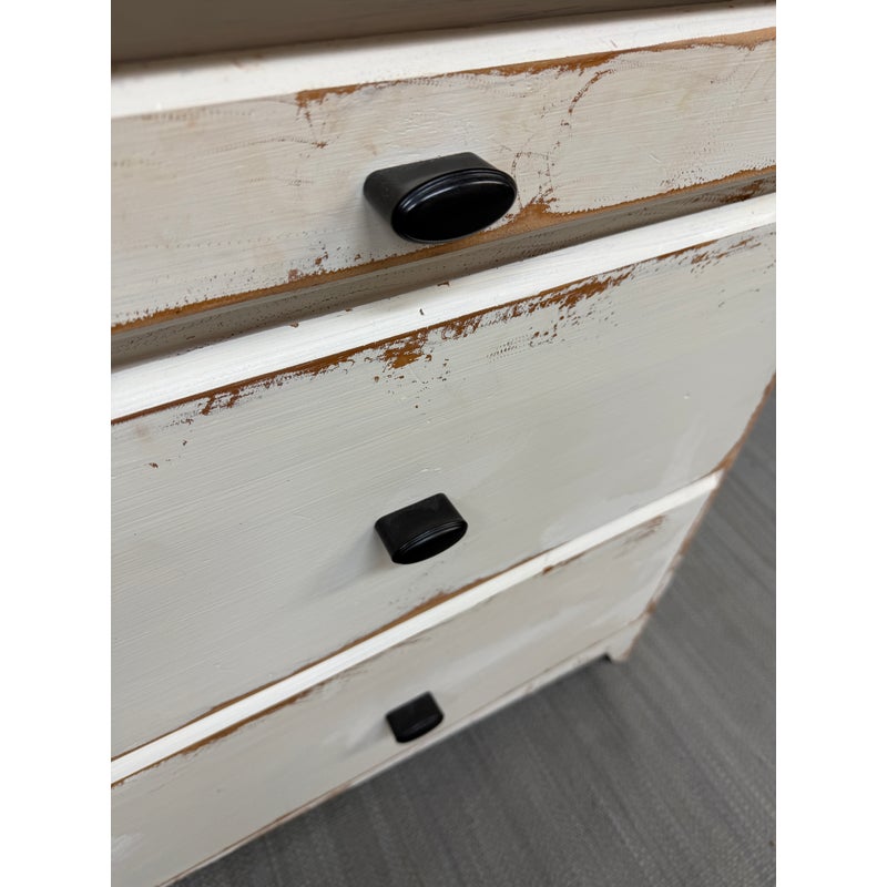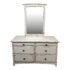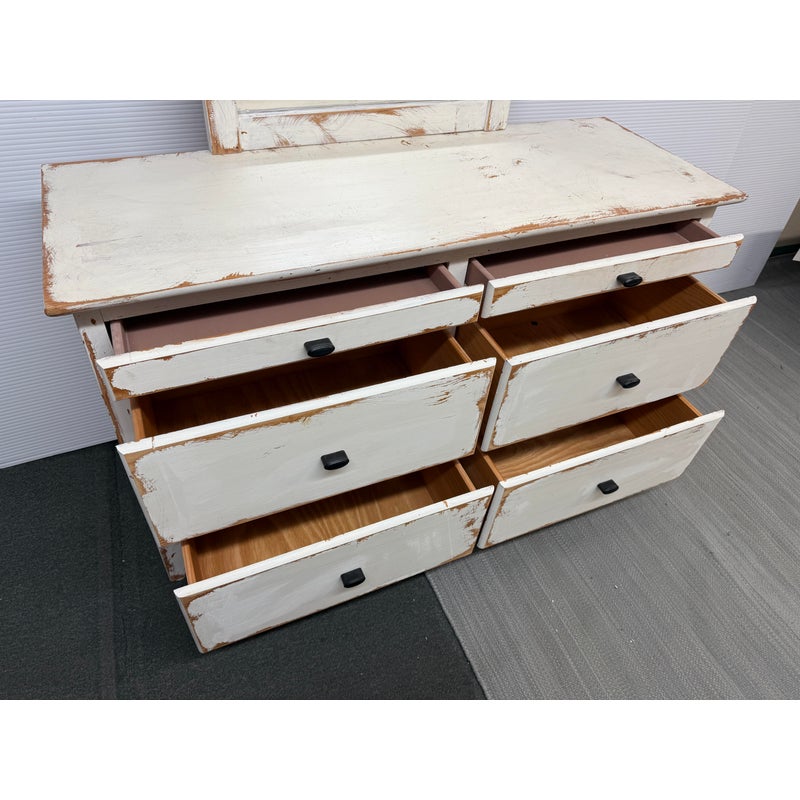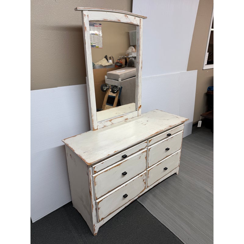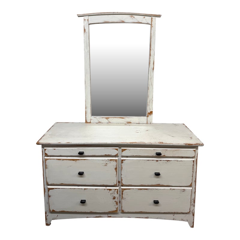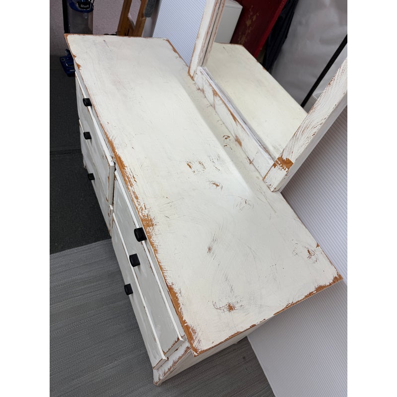 Design Plus Gallery presents a Vintage Dresser + Mirror. The shabby chic finish of this vintage dresser adds charm with character. There are six drawers of roomy storage topped with subtly arched mirror. The mirror slides into support brackets. Distressed surface is intentional; visible surface wear; condition is fair. Made in Brazil.