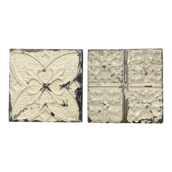 Design Plus Gallery presents a Pair of Shabby Chic Wall Hanging Tiles. The tiles are metal with a distressed white finish and textured accenting. The backs are reinforced on the edges with short wood beams. The finish has some crackle. Minor wear consistent with use; tiles are in good condition. Purchased in New York, United States.