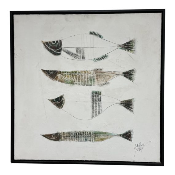 Design Plus Gallery presents a Shannon Schultz Hand Painted Fish Framed Painting. Signed by the artist in the lower right corner. Whimsical etched fish silhouettes are pronounces with the earthy brushstrokes. Framed with a black wood perimeter. Minor wear on the wood frame, good condition.