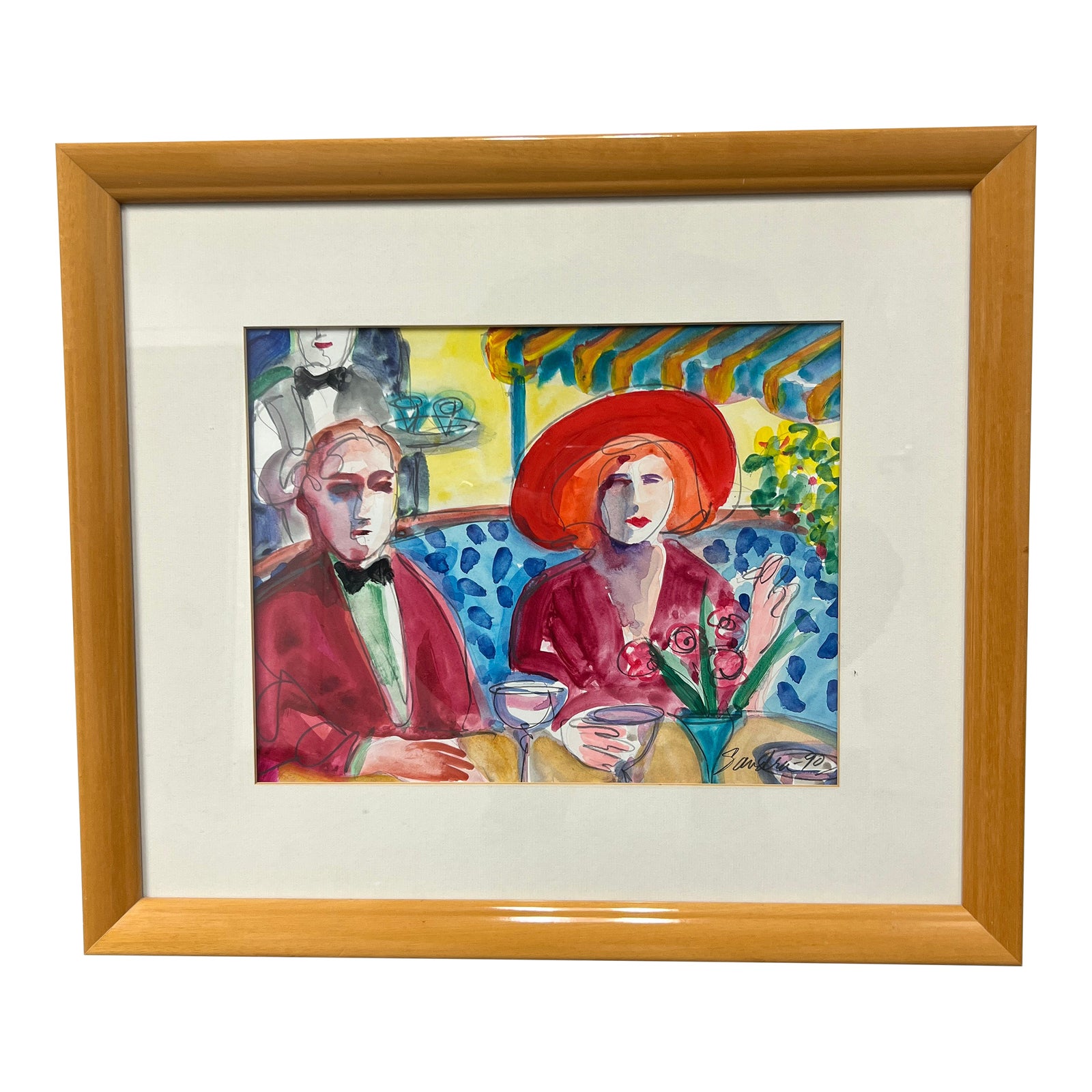 Design Plus Gallery presents a Couple in Cafe Painting Titled ‘Sharon 90’. This painting has bold colors over the black tracing which gives the image a dynamic appeal. Brightly made it will stand out in the home. Custom frame wood in a maple finish.