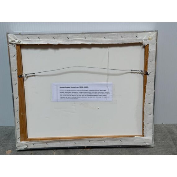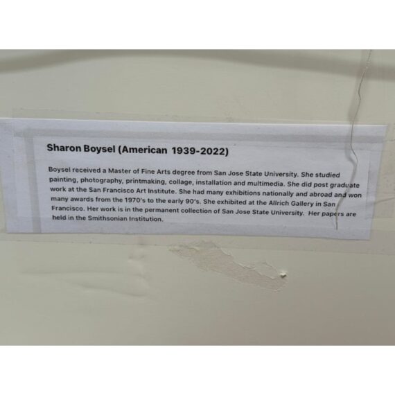 “Sharon was born into an artistic family who lived in Venice, Florida and Canton, Michigan. She received a Master of Fine Arts degree from San Jose State University. She studied painting, photography, printmaking, collage, installation and multimedia. She did post graduate work at the San Francisco Art Institute. She had many exhibitions nationally and abroad and won many awards from the 1970’s to the early 90’s. She exhibited the Allrich Gallery in San Francisco among others. Her work is in the permanent collection of San Jose State a University. Her papers are held in the Smithsonian archives. She was also a collector of other artists works and together with her husband, Tech Pioneer Lee Boysel, she selected works that appealed to her connoisseurs eye for their collection.