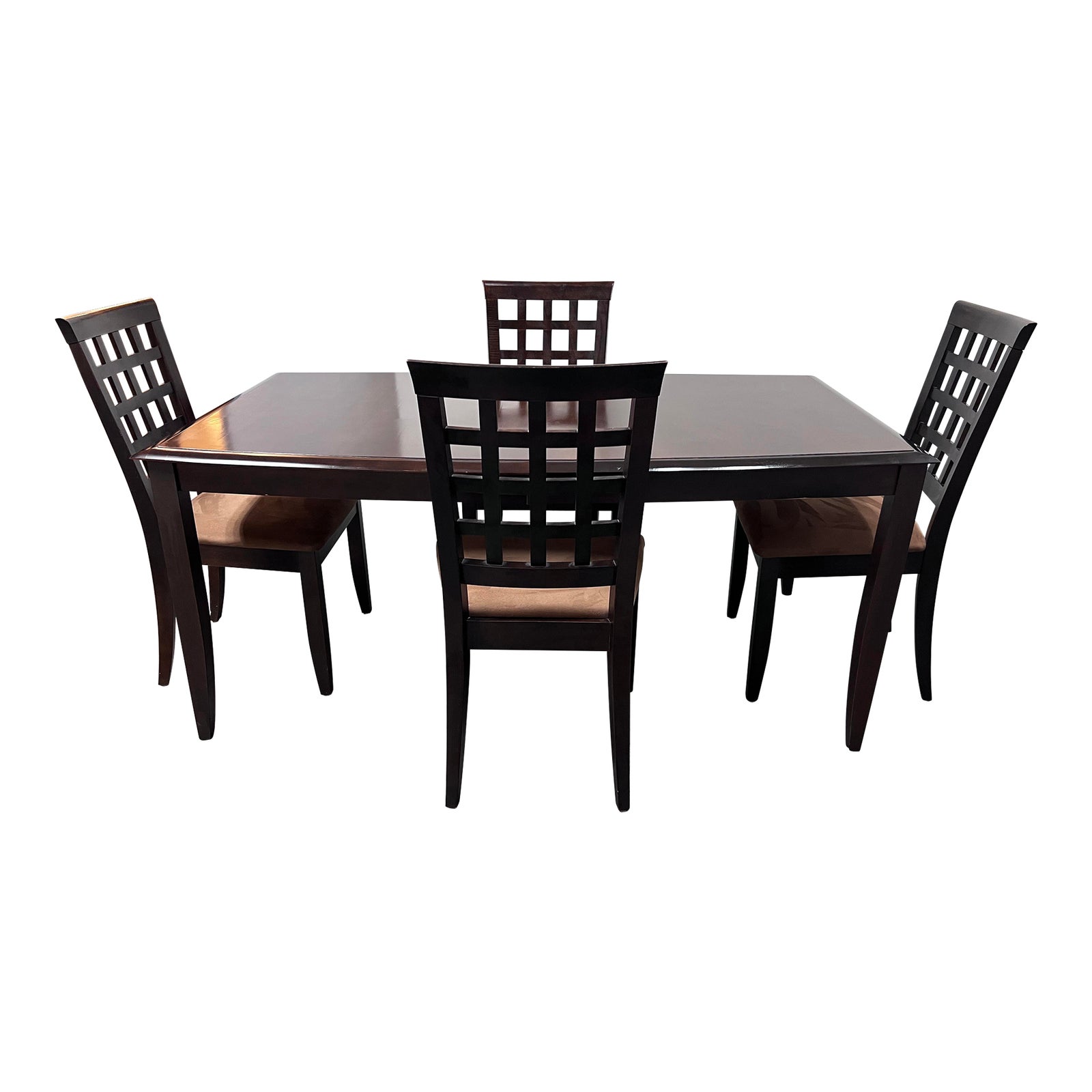 Design Plus Gallery presents an Extension Dining Room Table + Set of Four Dining Room Chairs by Sherman Furniture. The chairs have a beautiful presence with a grid like seat back and a tan ultra suede padded seat. The table has one removable table leaf that will add an additional 20 inches to entire length. Made in Canada.