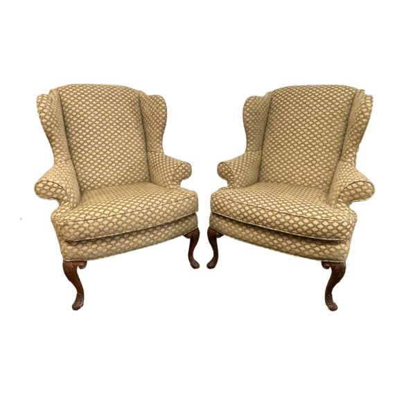 Design Plus Gallery presents a Pair of Wingback Chairs by Sherrill Furniture Company. A textural upholstery in taupe and tan criss crosses this lovely neutral pair of chairs. Built for long visits, the chairs are cushioned comfortable with tight back and loose foam seat. Gentle curves and curved front legs are classic Wingback styling. Double the pleasure. Seat height is 21.5″