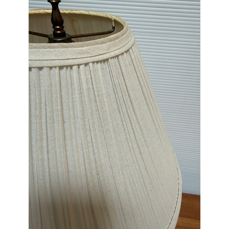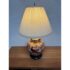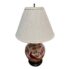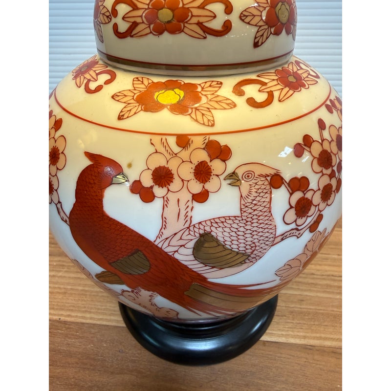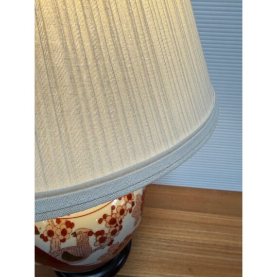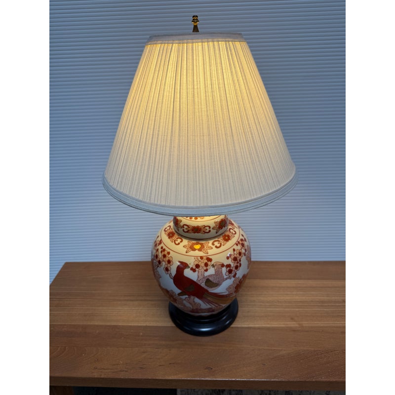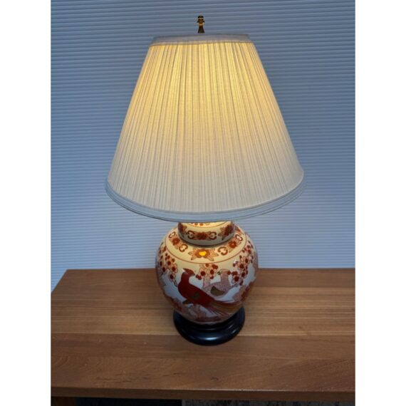 Design Plus Gallery presents a Ginger Jar Table Lamp from Shibui Ware. The lamp is from the mid 20th Century and is made of fine porcelain. It has 22k gold trim around the neck and in some accent areas. There are cherry blossoms and pheasant birds encircling the body in colors of light pink to burnt orange. The table lamp comes with a nicely pleated shade in off white. It is a converted ginger jar into a table lamp and is in good condition.