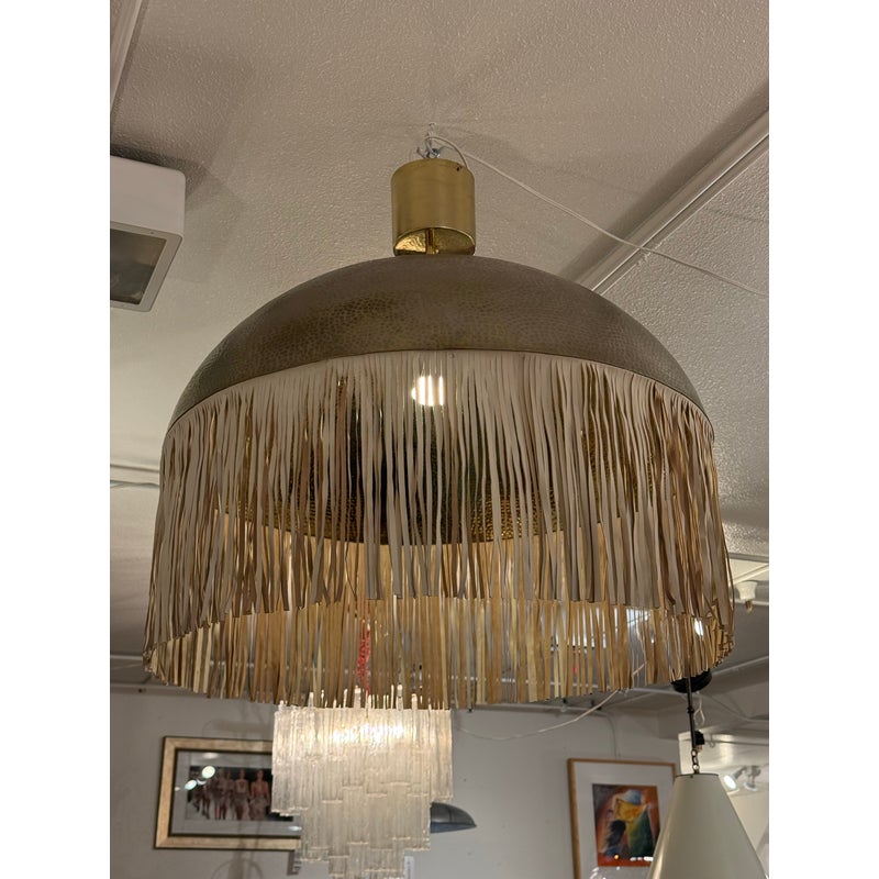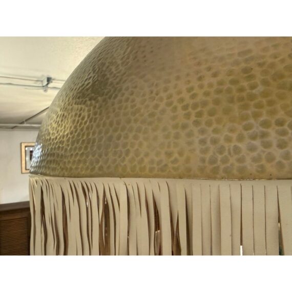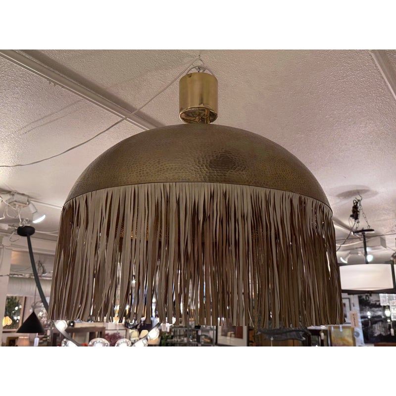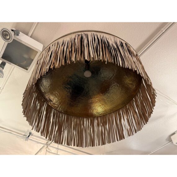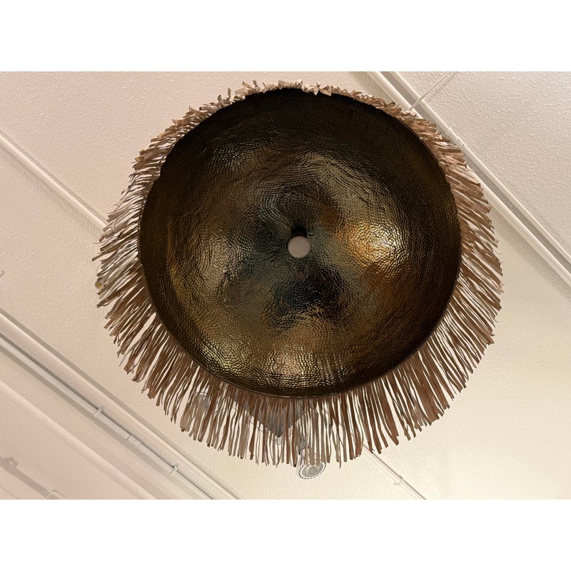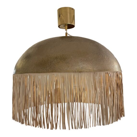 Design Plus Gallery presents the Verge Pendant from Shine by S.H.O. A hammered brass dome catches the eye with a luminous golden tone, while leather fringe forms a playful silhouette that filters light with movement and allure. The dramatic contrast between the textured metal surface and the fluid fringe gives the pendant a glamorous, femme-fatale character with unmistakable presence. It is in good condition with visible and minimal wear from usage.