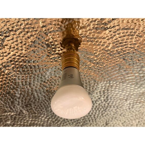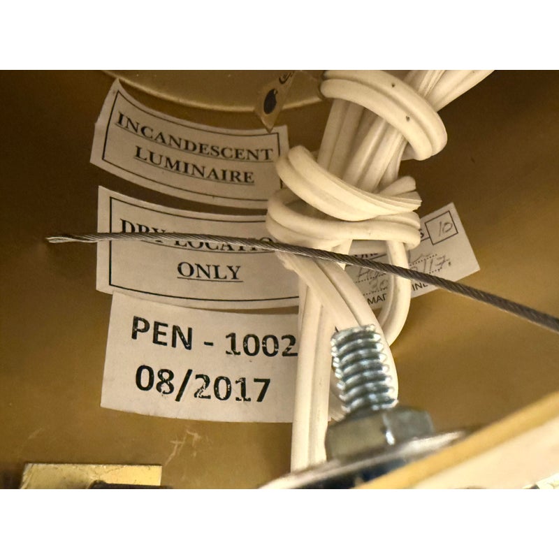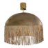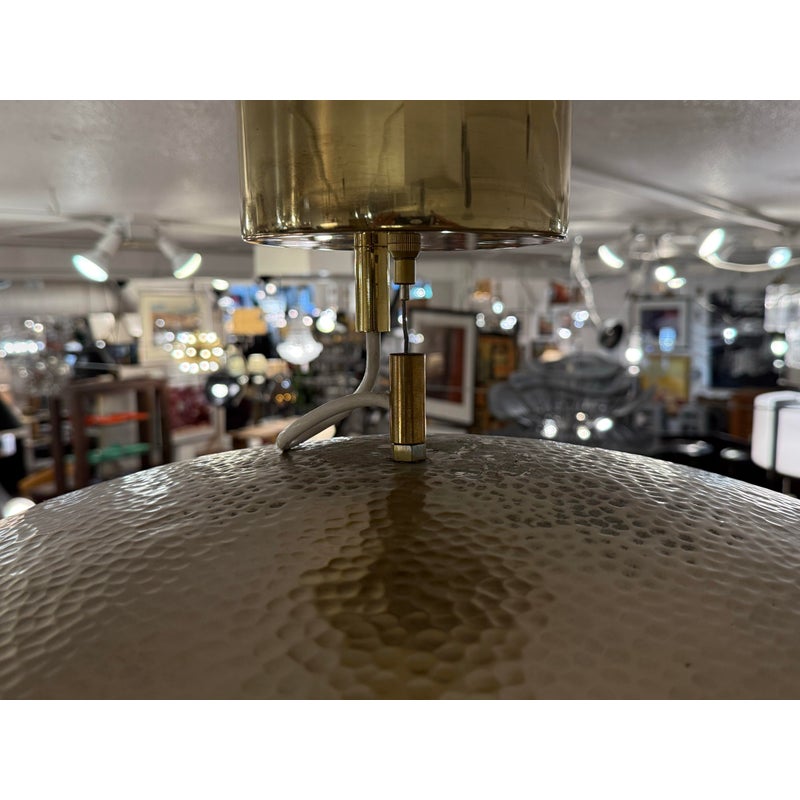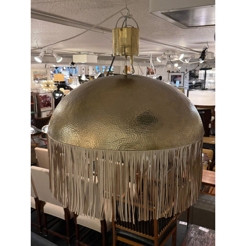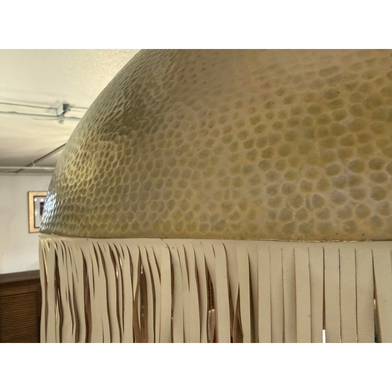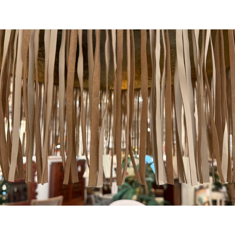 Design Plus Gallery presents the Verge Pendant from Shine by S.H.O. A hammered brass dome catches the eye with a luminous golden tone, while leather fringe forms a playful silhouette that filters light with movement and allure. The dramatic contrast between the textured metal surface and the fluid fringe gives the pendant a glamorous, femme-fatale character with unmistakable presence. It is in good condition with visible and minimal wear from usage.