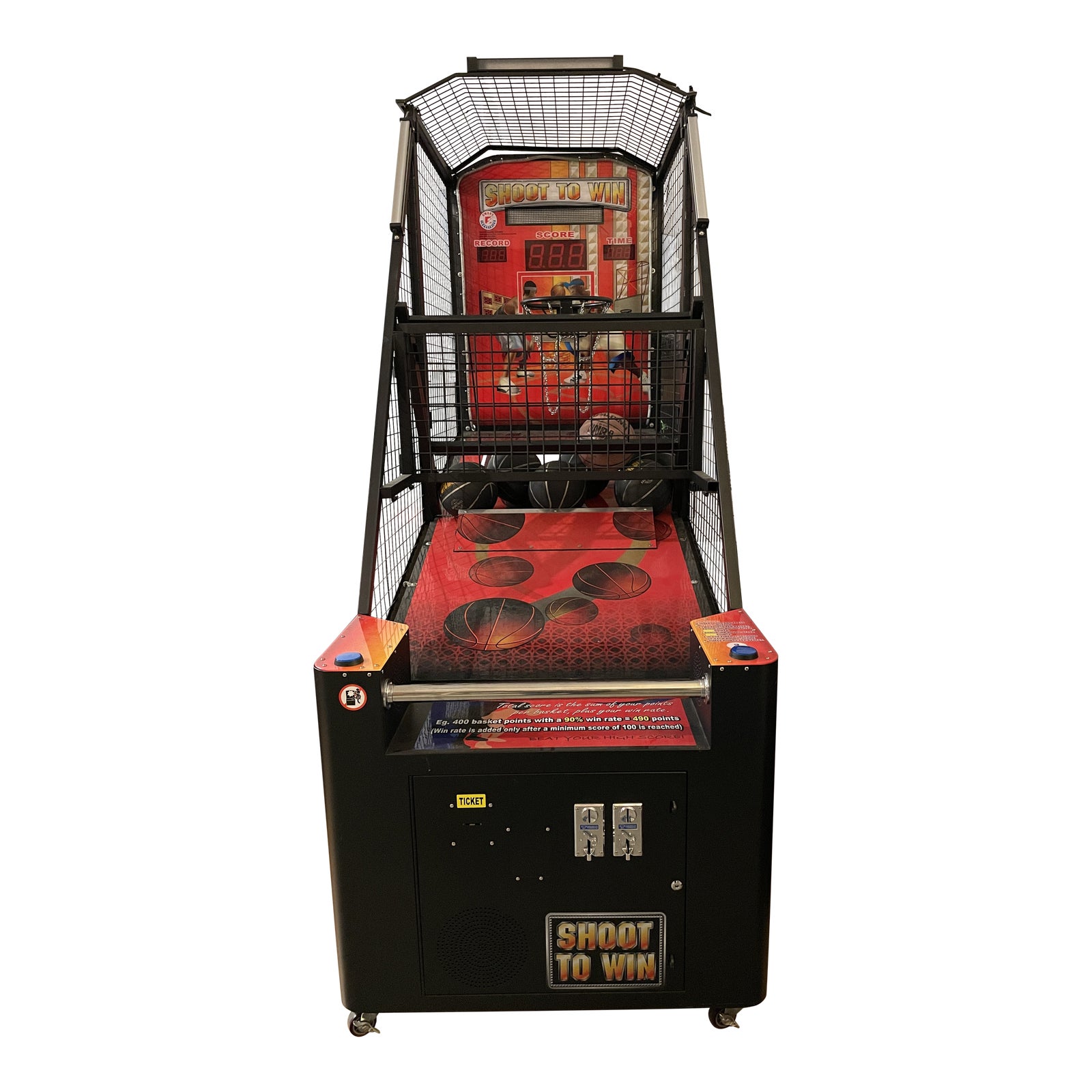 Design Plus Gallery presents a Shoot To Win Basketball Arcade Game. Smart Industries extremely popular basketball game is back with an updated look! Score enough points on the first round and you get the chance to play up to two more rounds with the moving hoop. Easy assembly, fits through standard doorways before assembly. Can link up to 16 units for head-to-head competition. All Steel Cabinet and Hardwood floor. Durable Polycarbonate backboard, great sound effects with music. Adjustable playing time and locking coin box.