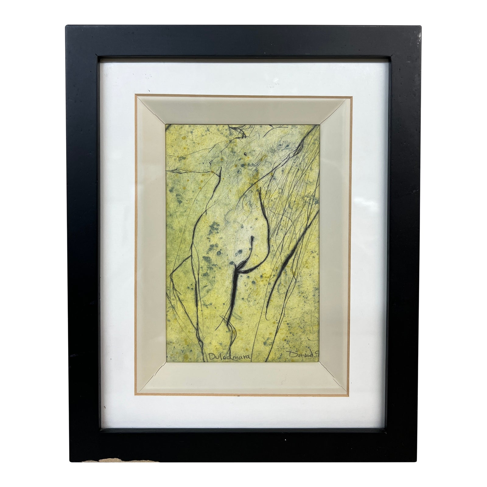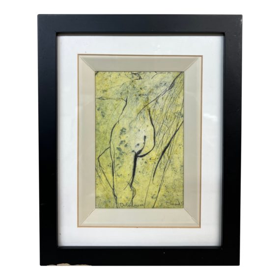 Design Plus Gallery presents “Dulcamara” Mixed Media Art Work. Signed by Artist, the nude drawing in ink and pencil against handmade paper creates layers of interest. The piece’s title Dulcamara, otherwise known as Bittersweet Nightshade, eludes to many unknown factors. Framed in linen and simple black wood frame. Little evidence of wear; condition is consistent with age and use.