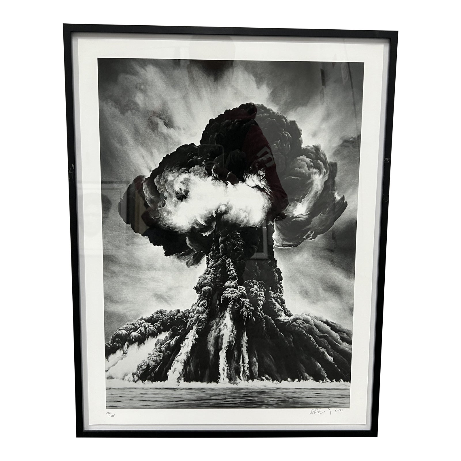 Design Plus Gallery presents a Framed Artwork of an Exploded Atomic Bomb, Masterfully Rendered in Charcoal. The powerful and destructive capabilities of the atomic bomb are conveyed with intense detail and a striking realism, almost as if one were witnessing a photograph of the event. The piece is signed and numbered as number 34 of 35. In good condition, this print is a terrifying reminder of the dangers of nuclear weapons.