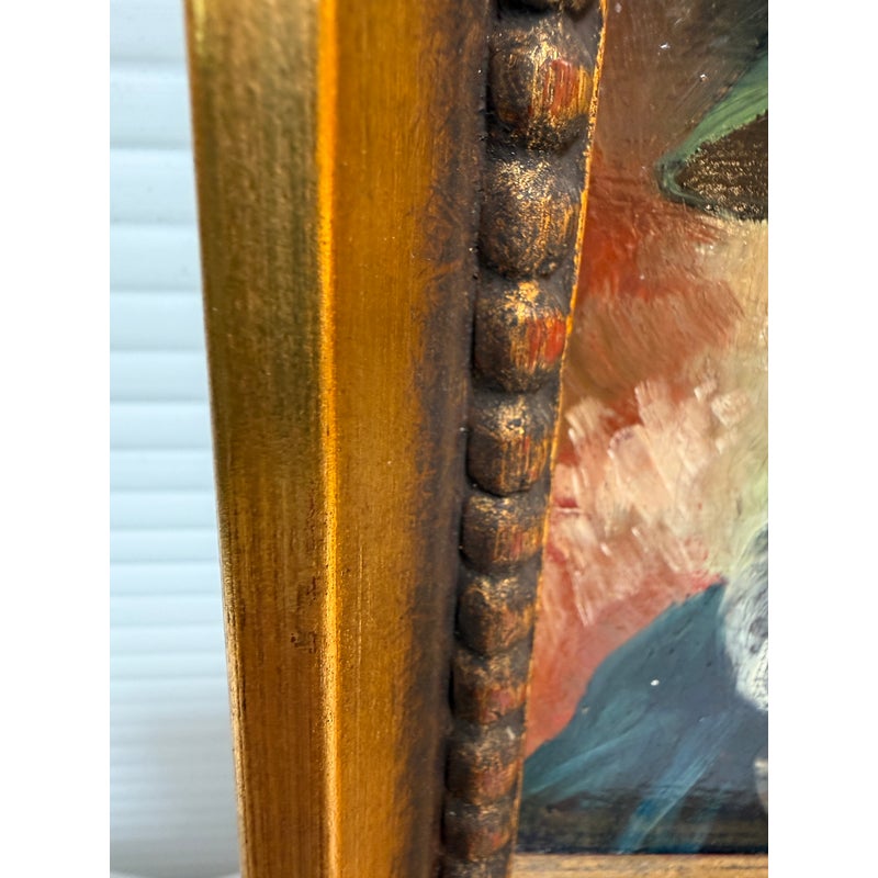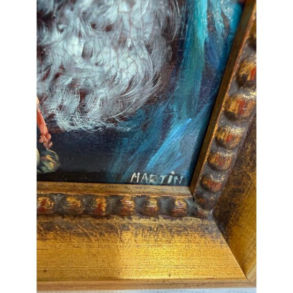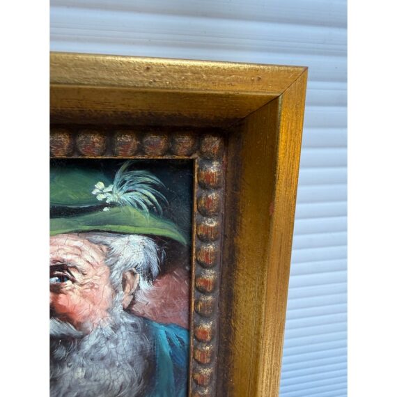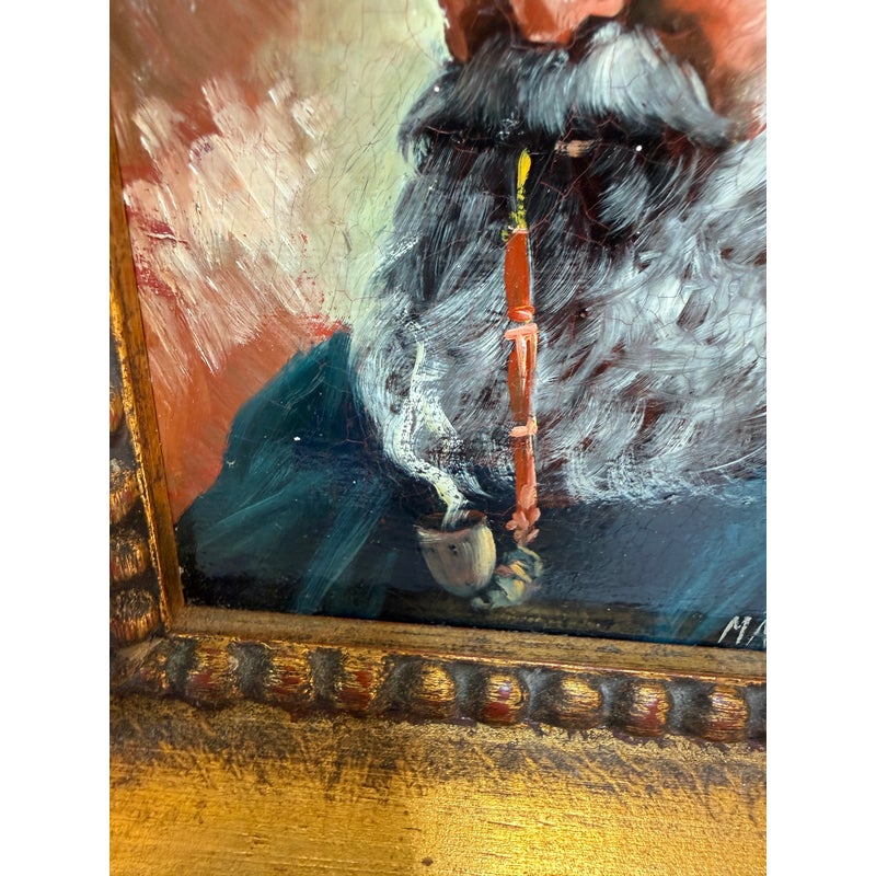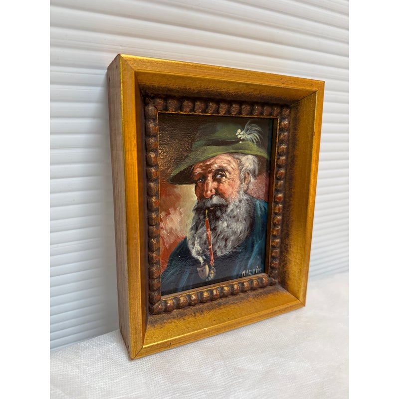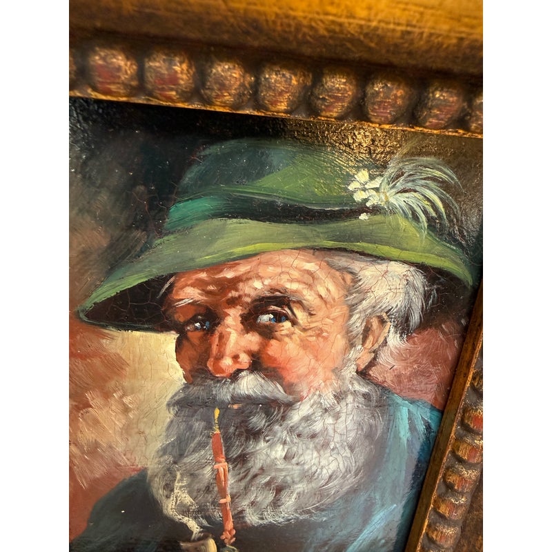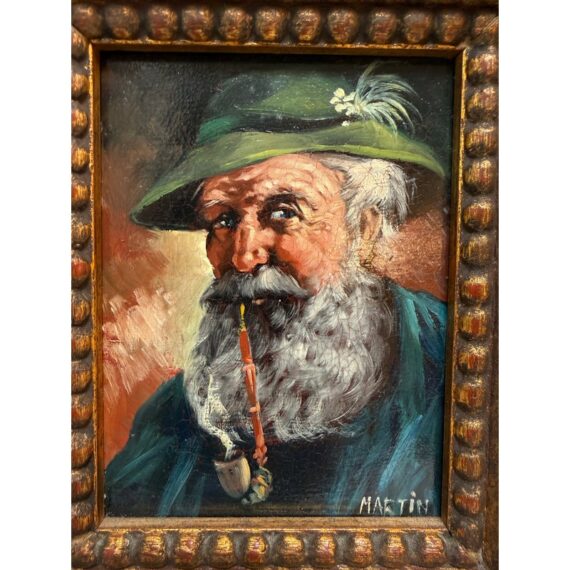 Design Plus Gallery presents a Framed Oil Painting Signed by Artist Martin. This charming vintage painting is a portrait to an wise old Bavarian man. He is portrayed with a distinguished white beard with piercing blue eyes that speak to wisdom and character. Atop his head rests a classic green German hat and a vibrant red pipe. The subject’s gaze and gentle smile capture is like a wink in time to the Bavarian countryside. The artwork is encased in a wood frame with an antique golden finish to enhance its old-world charm. The piece bears the artist’s signature Martin in the bottom right corner. In good condition for antique age and shows a network of fine cracks to the paintings surface.