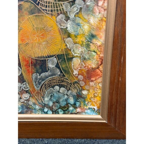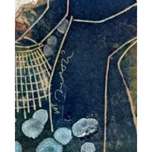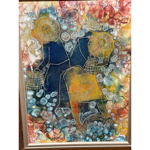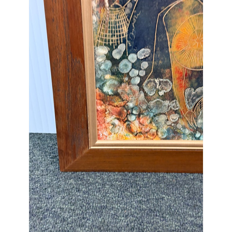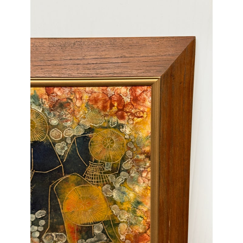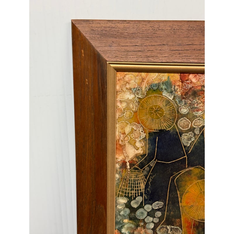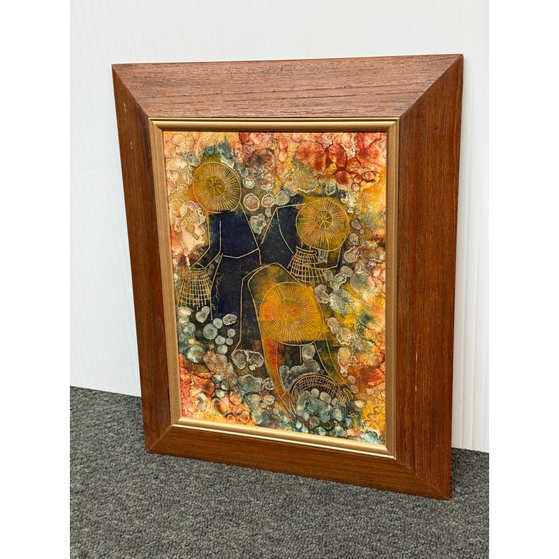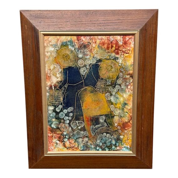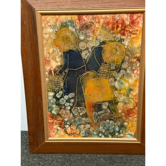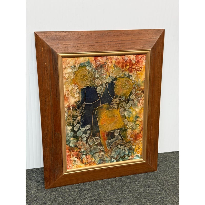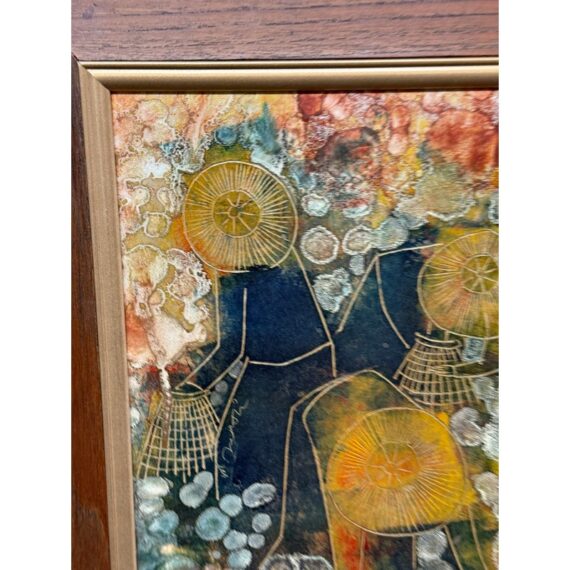 Design Plus Gallery presents an Original Painting on Linocut Board. The carved lines are clearly defined, and colorfully painted to show this working group beautifully. Gathering into baskets, the three workers move quietly within the wood frame. Artist signature on left figure. Light surface wear; condition is good.
